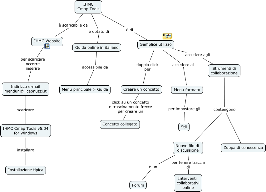 Questa Cmap, creata con IHMC CmapTools, contiene informazioni relative a: Scaricare e usare Cmap Tools, Nuovo filo di discussione è un Forum, Creare un concetto click su un concetto e trascinamento frecce per creare un Concetto collegato, Nuovo filo di discussione per tenere traccia di Interventi collaborativi online, Strumenti di collaborazione contengono Zuppa di conoscenza, IHMC Website per scaricare occorre inserire Indirizzo e-mail menduni@liceonuzzi.it, IHMC Cmap Tools è scaricabile da IHMC Website, Menu formato per impostare gli Stli, Semplice utilizzo accedere agli Strumenti di collaborazione, Indirizzo e-mail menduni@liceonuzzi.it scaricare IHMC Cmap Tools v5.04 for Windows, IHMC Cmap Tools è di Semplice utilizzo, Strumenti di collaborazione contengono Nuovo filo di discussione, Semplice utilizzo doppio click per Creare un concetto, Semplice utilizzo accedere al Menu formato, Guida online in italiano accessibile da Menu principale > Guida, IHMC Cmap Tools v5.04 for Windows installare Installazione tipica, IHMC Cmap Tools è dotato di Guida online in italiano