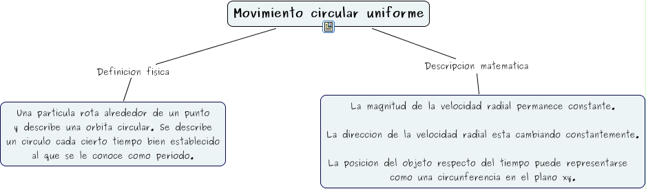 Este Cmap, tiene información relacionada con: Movimiento Circular Uniforme, Movimiento circular uniforme Definicion fisica Una particula rota alrededor de un punto y describe una orbita circular. Se describe un circulo cada cierto tiempo bien establecido al que se le conoce como periodo., Movimiento circular uniforme Descripcion matematica La magnitud de la velocidad radial permanece constante. La direccion de la velocidad radial esta cambiando constantemente. La posicion del objeto respecto del tiempo puede representarse como una circunferencia en el plano xy.