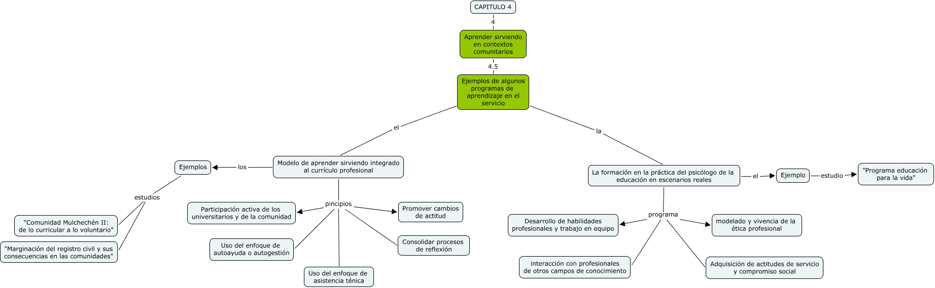 Este Cmap, tiene información relacionada con: 45, La formación en la práctica del psicólogo de la educación en escenarios reales programa interacción con profesionales de otros campos de conocimiento, Modelo de aprender sirviendo integrado al currículo profesional pincipios Participación activa de los universitarios y de la comunidad, Modelo de aprender sirviendo integrado al currículo profesional pincipios Promover cambios de actitud, Ejemplos de algunos programas de aprendizaje en el servicio el Modelo de aprender sirviendo integrado al currículo profesional, Ejemplos de algunos programas de aprendizaje en el servicio la La formación en la práctica del psicólogo de la educación en escenarios reales, Aprender sirviendo en contextos comunitarios 4.5 Ejemplos de algunos programas de aprendizaje en el servicio, La formación en la práctica del psicólogo de la educación en escenarios reales programa Adquisición de actitudes de servicio y compromiso social, La formación en la práctica del psicólogo de la educación en escenarios reales programa modelado y vivencia de la ética profesional, CAPITULO 4 4 Aprender sirviendo en contextos comunitarios, La formación en la práctica del psicólogo de la educación en escenarios reales el Ejemplo, Modelo de aprender sirviendo integrado al currículo profesional pincipios Uso del enfoque de autoayuda o autogestión, Ejemplos estudios "Marginación del registro civil y sus consecuencias en las comunidades", Modelo de aprender sirviendo integrado al currículo profesional pincipios Consolidar procesos de reflexión, La formación en la práctica del psicólogo de la educación en escenarios reales programa Desarrollo de habilidades profesionales y trabajo en equipo, Modelo de aprender sirviendo integrado al currículo profesional los Ejemplos, Ejemplo estudio "Programa educación para la vida", Modelo de aprender sirviendo integrado al currículo profesional pincipios Uso del enfoque de asistencia ténica, Ejemplos estudios "Comunidad Mulchechén II: de lo curricular a lo voluntario"
