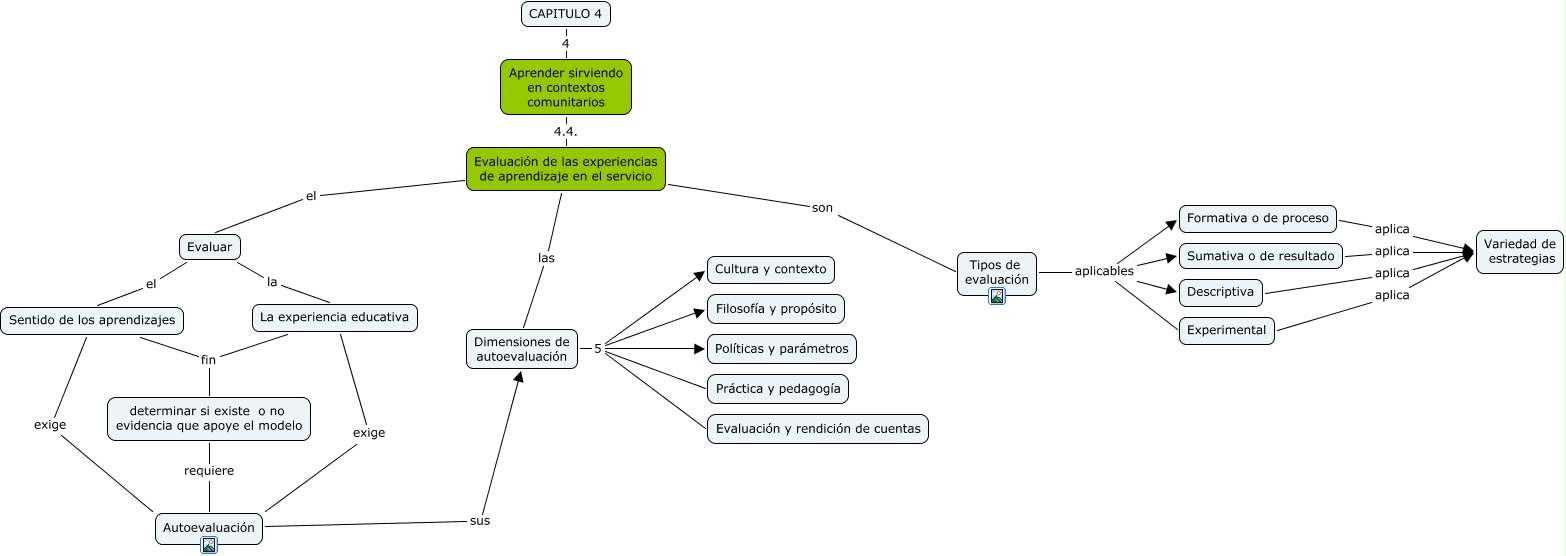 Este Cmap, tiene información relacionada con: 44, Evaluar el Sentido de los aprendizajes, Autoevaluación sus Dimensiones de autoevaluación, Evaluación de las experiencias de aprendizaje en el servicio son Tipos de evaluación, Dimensiones de autoevaluación 5 Cultura y contexto, Dimensiones de autoevaluación 5 Evaluación y rendición de cuentas, Sentido de los aprendizajes fin determinar si existe o no evidencia que apoye el modelo, La experiencia educativa fin determinar si existe o no evidencia que apoye el modelo, Formativa o de proceso aplica Variedad de estrategias, Descriptiva aplica Variedad de estrategias, Dimensiones de autoevaluación 5 Políticas y parámetros, La experiencia educativa exige Autoevaluación, Dimensiones de autoevaluación 5 Práctica y pedagogía, Tipos de evaluación aplicables Experimental, Evaluación de las experiencias de aprendizaje en el servicio las Dimensiones de autoevaluación, Dimensiones de autoevaluación 5 Filosofía y propósito, Evaluación de las experiencias de aprendizaje en el servicio el Evaluar, CAPITULO 4 4 Aprender sirviendo en contextos comunitarios, Tipos de evaluación aplicables Formativa o de proceso, Tipos de evaluación aplicables Sumativa o de resultado, determinar si existe o no evidencia que apoye el modelo requiere Autoevaluación