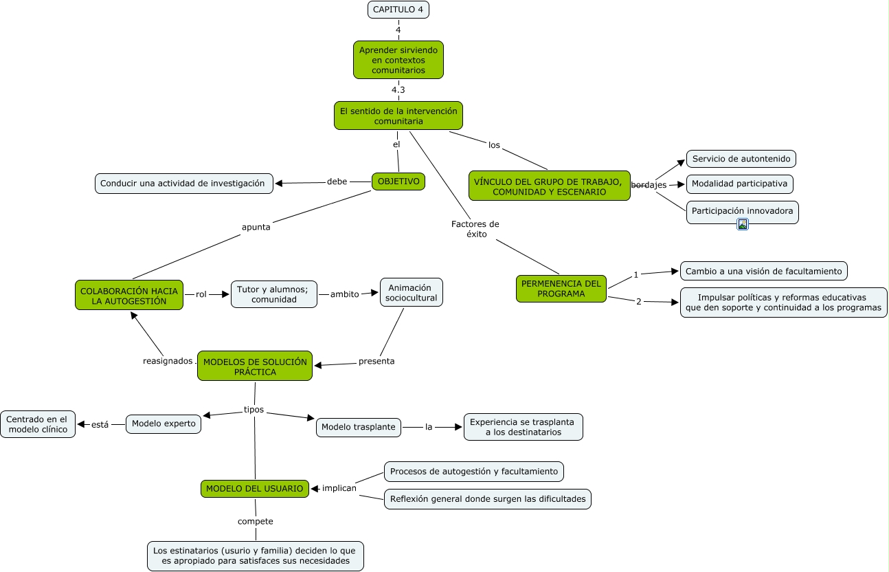 Este Cmap, tiene información relacionada con: 43, Modelo trasplante la Experiencia se trasplanta a los destinatarios, MODELOS DE SOLUCIÓN PRÁCTICA tipos Modelo trasplante, PERMENENCIA DEL PROGRAMA 2 Impulsar políticas y reformas educativas que den soporte y continuidad a los programas, COLABORACIÓN HACIA LA AUTOGESTIÓN rol Tutor y alumnos; comunidad, Tutor y alumnos; comunidad ambito Animación sociocultural, El sentido de la intervención comunitaria Factores de éxito PERMENENCIA DEL PROGRAMA, Aprender sirviendo en contextos comunitarios 4.3 El sentido de la intervención comunitaria, OBJETIVO debe Conducir una actividad de investigación, VÍNCULO DEL GRUPO DE TRABAJO, COMUNIDAD Y ESCENARIO abordajes Participación innovadora, Reflexión general donde surgen las dificultades implican MODELO DEL USUARIO, MODELOS DE SOLUCIÓN PRÁCTICA tipos Modelo experto, VÍNCULO DEL GRUPO DE TRABAJO, COMUNIDAD Y ESCENARIO abordajes Modalidad participativa, OBJETIVO apunta COLABORACIÓN HACIA LA AUTOGESTIÓN, Procesos de autogestión y facultamiento implican MODELO DEL USUARIO, MODELOS DE SOLUCIÓN PRÁCTICA tipos MODELO DEL USUARIO, MODELO DEL USUARIO compete Los estinatarios (usurio y familia) deciden lo que es apropiado para satisfaces sus necesidades, VÍNCULO DEL GRUPO DE TRABAJO, COMUNIDAD Y ESCENARIO abordajes Servicio de autontenido, MODELOS DE SOLUCIÓN PRÁCTICA reasignados COLABORACIÓN HACIA LA AUTOGESTIÓN, CAPITULO 4 4 Aprender sirviendo en contextos comunitarios, Animación sociocultural presenta MODELOS DE SOLUCIÓN PRÁCTICA