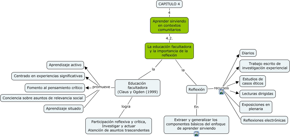 Este Cmap, tiene información relacionada con: 42, Educación facultadora (Claus y Ogden (1999) promueve Conciencia sobre asuntos de relevancia social, Educación facultadora (Claus y Ogden (1999) promueve Aprendizaje situado, Reflexión recursos Exposiciones en plenaria, Reflexión recursos Lecturas dirigidas, Educación facultadora (Claus y Ogden (1999) promueve Aprendizaje activo, La educación facultadora y la importancia de la reflexión la Educación facultadora (Claus y Ogden (1999), Reflexión fín Extraer y generalizar los componentes básicos del enfoque de aprender sirviendo, Educación facultadora (Claus y Ogden (1999) promueve Centrado en experiencias significativas, Aprender sirviendo en contextos comunitarios 4.2. La educación facultadora y la importancia de la reflexión, Reflexión recursos Diarios, Educación facultadora (Claus y Ogden (1999) promueve Fomento al pensamiento crítico, Reflexión recursos Estudios de casos éticos, La educación facultadora y la importancia de la reflexión la Reflexión, CAPITULO 4 4 Aprender sirviendo en contextos comunitarios, Reflexión recursos Reflexiones electrónicas, Reflexión recursos Trabajo escrito de investigación experiencial, Educación facultadora (Claus y Ogden (1999) logra Participación reflexiva y crítica, Investigar y actuar Atención de asuntos trascendentes