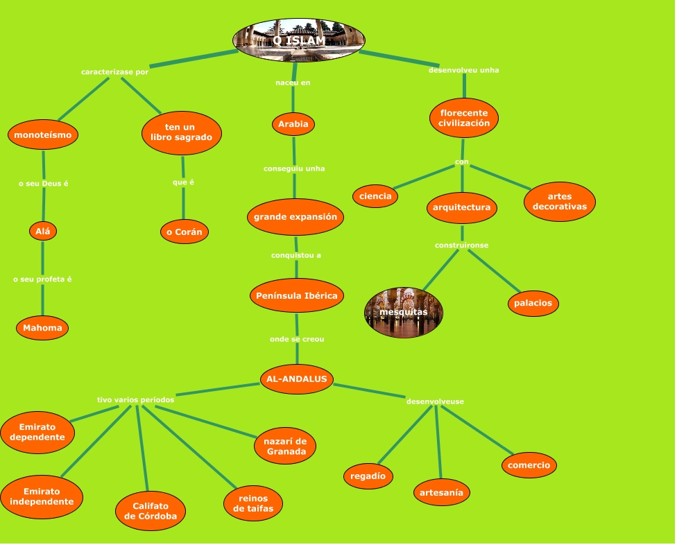 Este Cmap, tiene información relacionada con: islam, ten un libro sagrado que é o Corán, AL-ANDALUS desenvolveuse comercio, AL-ANDALUS desenvolveuse artesanía, O ISLAM caracterízase por monoteísmo, grande expansión conquistou a Península Ibérica, O ISLAM desenvolveu unha florecente civilización, florecente civilización con ciencia, AL-ANDALUS tivo varios períodos Emirato dependente, Península Ibérica onde se creou AL-ANDALUS, florecente civilización con arquitectura, Alá o seu profeta é Mahoma, arquitectura construíronse palacios, AL-ANDALUS tivo varios períodos reinos de taifas, florecente civilización con artes decorativas, O ISLAM naceu en Arabia, AL-ANDALUS desenvolveuse regadío, AL-ANDALUS tivo varios períodos nazarí de Granada, AL-ANDALUS tivo varios períodos Califato de Córdoba, O ISLAM caracterízase por ten un libro sagrado, AL-ANDALUS tivo varios períodos Emirato independente