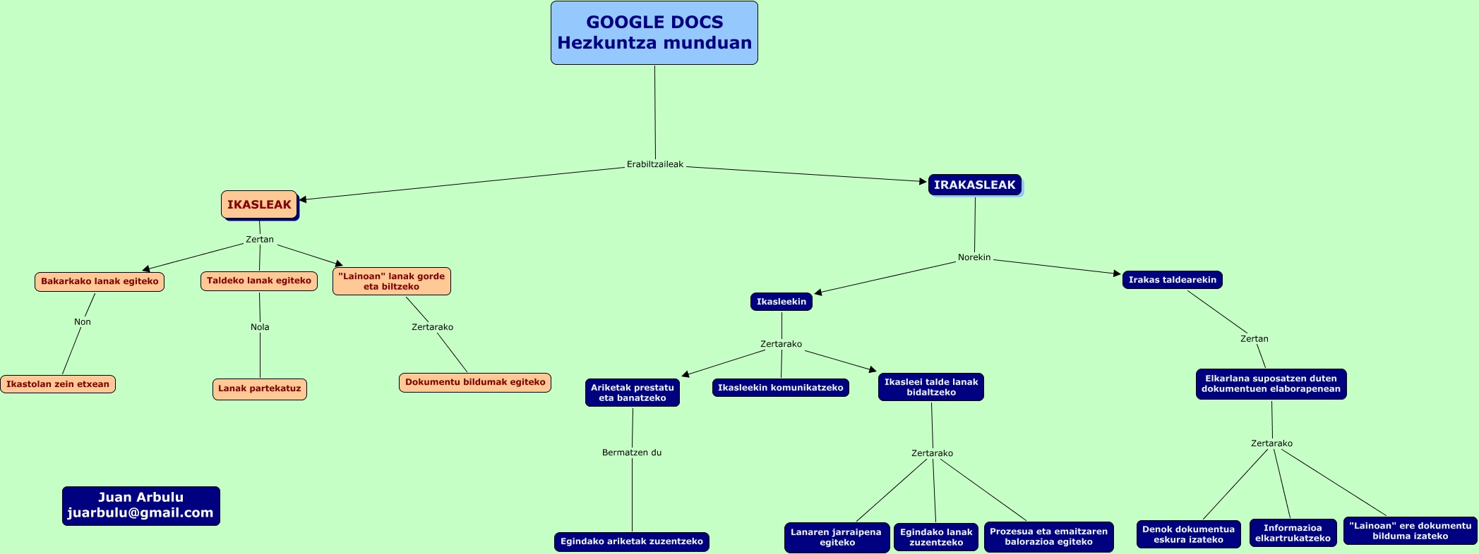 Este Cmap, tiene información relacionada con: Sin Título 1, Ikasleekin Zertarako Ariketak prestatu eta banatzeko, IKASLEAK Zertan "Lainoan" lanak gorde eta biltzeko, IKASLEAK Zertan Taldeko lanak egiteko, Ikasleei talde lanak bidaltzeko Zertarako Egindako lanak zuzentzeko, Ikasleekin Zertarako Ikasleei talde lanak bidaltzeko, Elkarlana suposatzen duten dokumentuen elaborapenean Zertarako Denok dokumentua eskura izateko, IRAKASLEAK Norekin Ikasleekin, Bakarkako lanak egiteko Non Ikastolan zein etxean, Ariketak prestatu eta banatzeko Bermatzen du Egindako ariketak zuzentzeko, Elkarlana suposatzen duten dokumentuen elaborapenean Zertarako "Lainoan" ere dokumentu bilduma izateko, Ikasleei talde lanak bidaltzeko Zertarako Prozesua eta emaitzaren balorazioa egiteko, Ikasleei talde lanak bidaltzeko Zertarako Lanaren jarraipena egiteko, GOOGLE DOCS Hezkuntza munduan Erabiltzaileak IKASLEAK, "Lainoan" lanak gorde eta biltzeko Zertarako Dokumentu bildumak egiteko, Irakas taldearekin Zertan Elkarlana suposatzen duten dokumentuen elaborapenean, Taldeko lanak egiteko Nola Lanak partekatuz, IKASLEAK Zertan Bakarkako lanak egiteko, Ikasleekin Zertarako Ikasleekin komunikatzeko, GOOGLE DOCS Hezkuntza munduan Erabiltzaileak IRAKASLEAK, IRAKASLEAK Norekin Irakas taldearekin