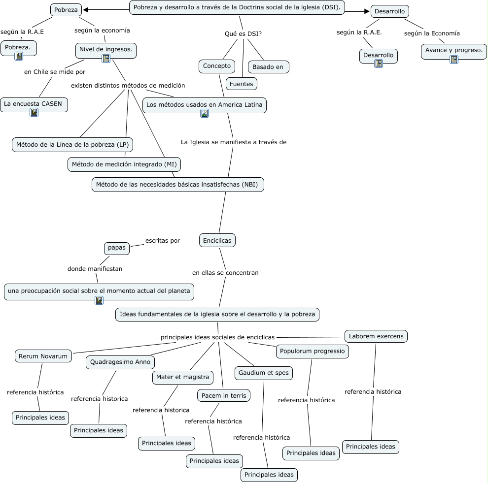 Este Cmap, tiene información relacionada con: pobreza y desarrollo, Pobreza y desarrollo a través de la Doctrina social de la iglesia (DSI). Qué es DSI? Fuentes, Mater et magistra referencia historica Principales ideas, Ideas fundamentales de la iglesia sobre el desarrollo y la pobreza principales ideas sociales de enciclicas Gaudium et spes, Desarrollo según la R.A.E. Desarrollo, Pobreza y desarrollo a través de la Doctrina social de la iglesia (DSI). ???? Pobreza, Concepto La Iglesia se manifiesta a través de Encíclicas, Pobreza y desarrollo a través de la Doctrina social de la iglesia (DSI). ???? Desarrollo, Ideas fundamentales de la iglesia sobre el desarrollo y la pobreza principales ideas sociales de enciclicas Quadragesimo Anno, Laborem exercens referencia histórica Principales ideas, Ideas fundamentales de la iglesia sobre el desarrollo y la pobreza principales ideas sociales de enciclicas Pacem in terris, Encíclicas en ellas se concentran Ideas fundamentales de la iglesia sobre el desarrollo y la pobreza, Desarrollo según la Economía Avance y progreso., papas donde manifiestan una preocupación social sobre el momento actual del planeta, Pobreza según la R.A.E Pobreza., Rerum Novarum referencia histórica Principales ideas, Nivel de ingresos. existen distintos métodos de medición Método de las necesidades básicas insatisfechas (NBI), Pobreza y desarrollo a través de la Doctrina social de la iglesia (DSI). Qué es DSI? Concepto, Nivel de ingresos. existen distintos métodos de medición Método de medición integrado (MI), Ideas fundamentales de la iglesia sobre el desarrollo y la pobreza principales ideas sociales de enciclicas Laborem exercens, Nivel de ingresos. en Chile se mide por La encuesta CASEN