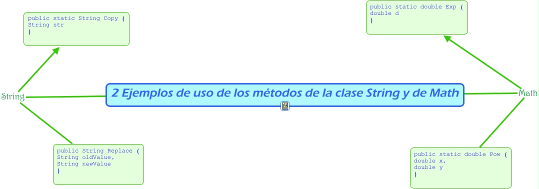 Este Cmap, tiene información relacionada con: ejemplos, 2 Ejemplos de uso de los métodos de la clase String y de Math String public static String Copy ( String str ), 2 Ejemplos de uso de los métodos de la clase String y de Math Math public static double Pow ( double x, double y ), 2 Ejemplos de uso de los métodos de la clase String y de Math String public String Replace ( String oldValue, String newValue ), 2 Ejemplos de uso de los métodos de la clase String y de Math Math public static double Exp ( double d )