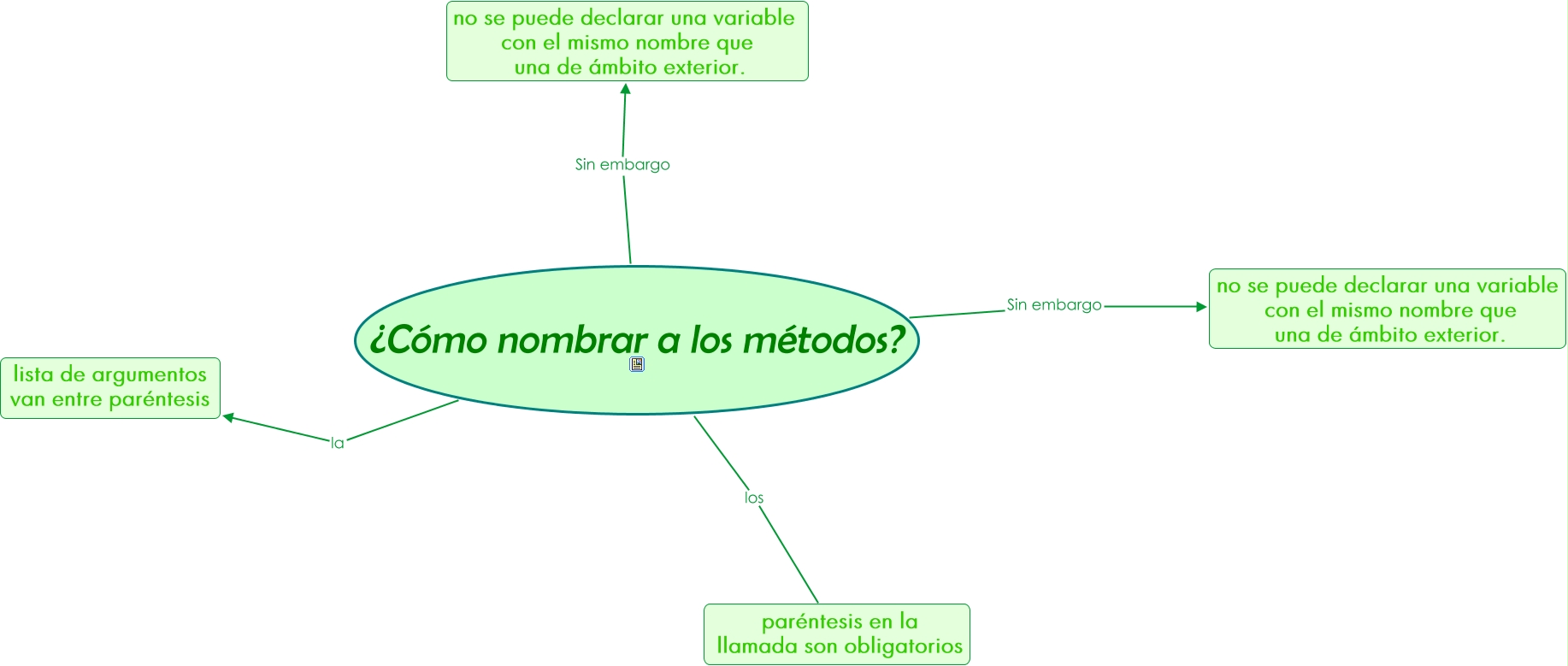 Este Cmap, tiene información relacionada con: como nombrar a los metodos, ¿Cómo nombrar a los métodos? los paréntesis en la llamada son obligatorios, ¿Cómo nombrar a los métodos? Sin embargo no se puede declarar una variable con el mismo nombre que una de ámbito exterior., ¿Cómo nombrar a los métodos? la lista de argumentos van entre paréntesis, ¿Cómo nombrar a los métodos? Sin embargo no se puede declarar una variable con el mismo nombre que una de ámbito exterior.