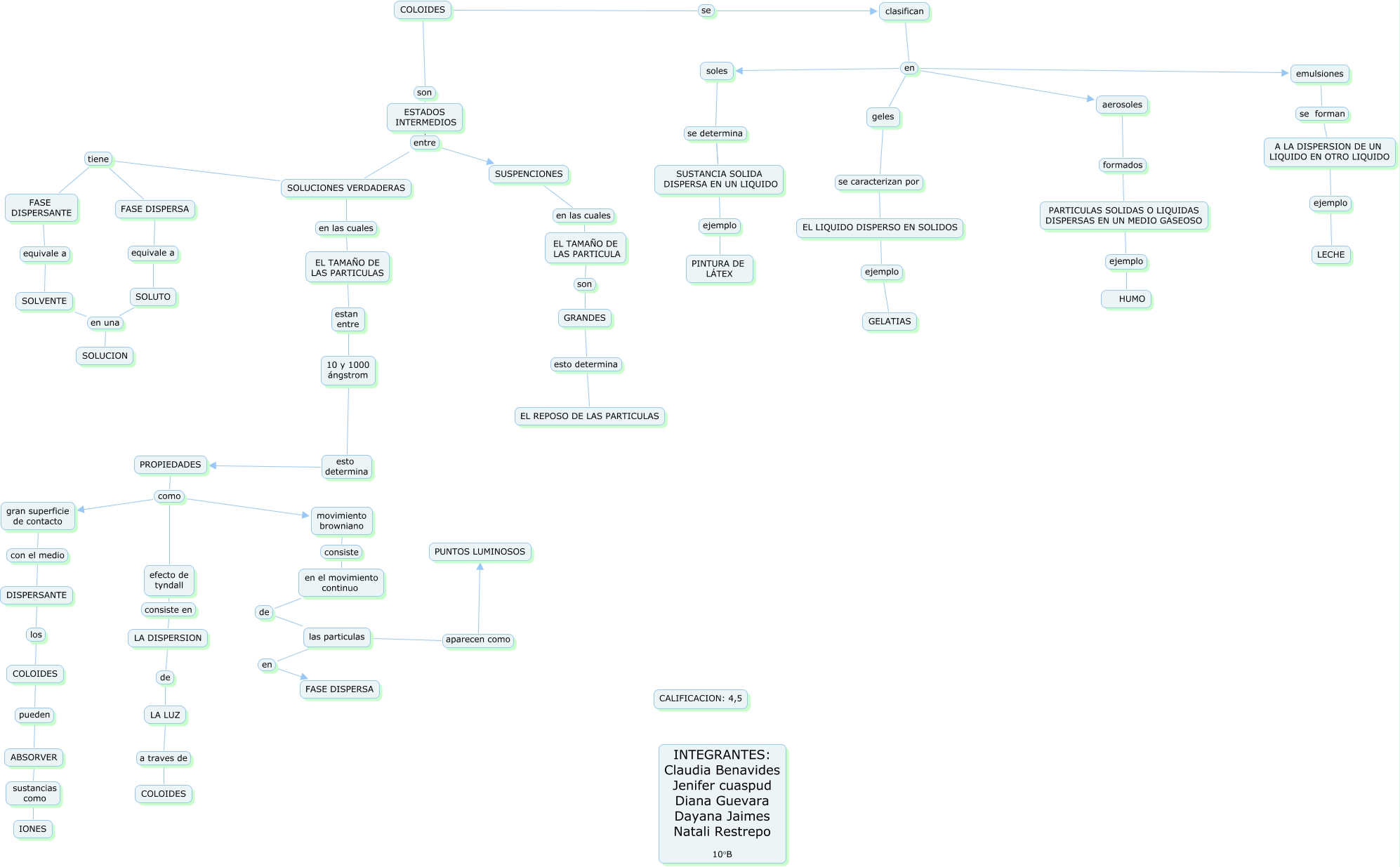 Este Cmap, tiene información relacionada con: COLOIDES NATALY RESTREPO, SUSTANCIA SOLIDA DISPERSA EN UN LIQUIDO ejemplo PINTURA DE LÁTEX, efecto de tyndall consiste en LA DISPERSION, SUSPENCIONES en las cuales EL TAMAÑO DE LAS PARTICULA, FASE DISPERSANTE equivale a SOLVENTE, PROPIEDADES como movimiento browniano, SOLUCIONES VERDADERAS tiene FASE DISPERSA, SOLUCIONES VERDADERAS tiene FASE DISPERSANTE, clasifican en emulsiones, emulsiones se forman A LA DISPERSION DE UN LIQUIDO EN OTRO LIQUIDO, COLOIDES se clasifican, COLOIDES son ESTADOS INTERMEDIOS, COLOIDES pueden ABSORVER, DISPERSANTE los COLOIDES, A LA DISPERSION DE UN LIQUIDO EN OTRO LIQUIDO ejemplo LECHE, PROPIEDADES como efecto de tyndall, SOLVENTE en una SOLUCION, LA DISPERSION de LA LUZ, SOLUCIONES VERDADERAS en las cuales EL TAMAÑO DE LAS PARTICULAS, las particulas aparecen como PUNTOS LUMINOSOS, PROPIEDADES como gran superficie de contacto