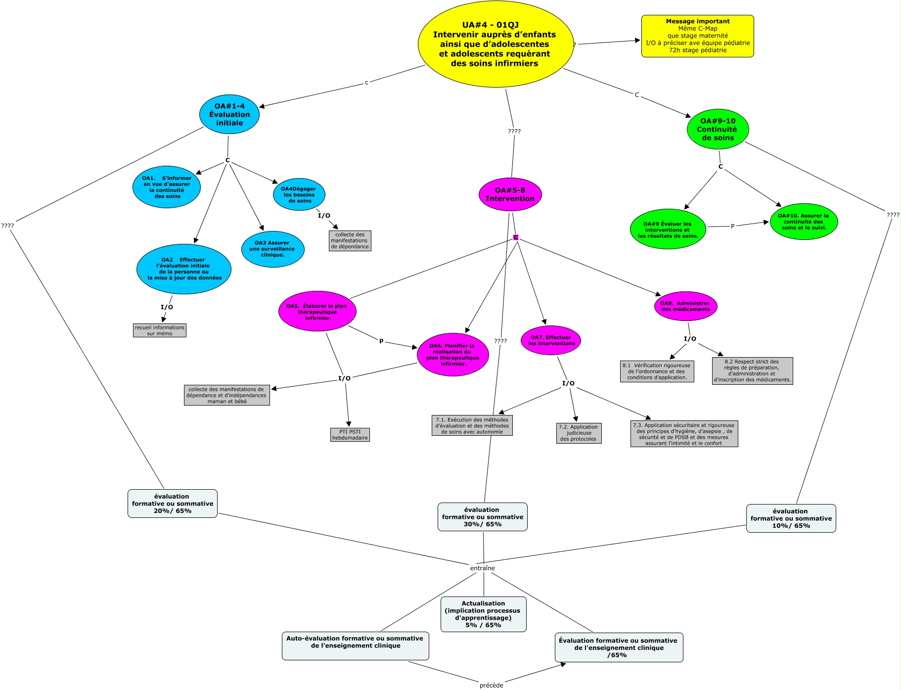 Cette carte de concepts créée avec IHMC CmapTools traite de: TIC 811 Nathalie Fournier UA4, OA#9-10 Continuité de soins ???? évaluation formative ou sommative 10%/ 65%, OA#5-8 Intervention C OA6. Planifier la réalisation du plan thérapeutique infirmier., évaluation formative ou sommative 20%/ 65% entraîne Évaluation formative ou sommative de l'enseignement clinique /65%, OA#1-4 Évaluation initiale C OA1. S’informer en vue d’assurer la continuité des soins, OA#5-8 Intervention C OA7. Effectuer les interventions, OA2 Effectuer l'évaluation initiale de la personne ou la mise à jour des données I/O recueil informations sur mémo, OA6. Planifier la réalisation du plan thérapeutique infirmier. I/O PTI PSTI hebdomadaire, OA#9 Évaluer les interventions et les résultats de soins. P OA#10. Assurer la continuité des soins et le suivi., évaluation formative ou sommative 10%/ 65% entraîne Évaluation formative ou sommative de l'enseignement clinique /65%, OA#1-4 Évaluation initiale C OA4Dégager les besoins de soins, évaluation formative ou sommative 10%/ 65% entraîne Auto-évaluation formative ou sommative de l'enseignement clinique, OA7. Effectuer les interventions I/O 7.2. Application judicieuse des protocoles, UA#4 - 01QJ Intervenir auprès d’enfants ainsi que d’adolescentes et adolescents requérant des soins infirmiers ???? OA#5-8 Intervention, OA#5-8 Intervention ???? évaluation formative ou sommative 30%/ 65%, Auto-évaluation formative ou sommative de l'enseignement clinique précède Évaluation formative ou sommative de l'enseignement clinique /65%, OA#9-10 Continuité de soins C OA#10. Assurer la continuité des soins et le suivi., OA5. Élaborer le plan thérapeutique infirmier. I/O collecte des manifestations de dépendance et d'indépendances maman et bébé, OA7. Effectuer les interventions I/O 7.1. Exécution des méthodes d’évaluation et des méthodes de soins avec autonomie, OA8. Administrer des médicaments I/O 8.1 Vérification rigoureuse de l’ordonnance et des conditions d’application., OA#9-10 Continuité de soins C OA#9 Évaluer les interventions et les résultats de soins.