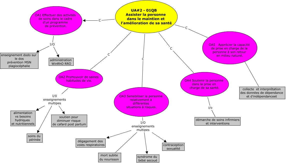 Cette carte de concepts créée avec IHMC CmapTools traite de: TIC 811 Nathalie Fournier UA2, OA3 Sensibiliser la personne relativement à différentes situations à risques. I/O enseignements multipes dégagement des voies respiratoires, UA#2 - 01QB Assister la personne dans le maintien et l’amélioration de sa santé C OA2 Promouvoir de saines habitudes de vie., OA2 Promouvoir de saines habitudes de vie. I/0 enseignements multipes soutien pour diminuer risque de cafard post partum, OA2 Promouvoir de saines habitudes de vie. I/0 enseignements multipes soins du périnée, OA1 Effectuer des activités de soins dans le cadre d’un programme de prévention. I/O enseignement dodo sur le dos prévention MSN plagiocéphalie, UA#2 - 01QB Assister la personne dans le maintien et l’amélioration de sa santé C OA1 Effectuer des activités de soins dans le cadre d’un programme de prévention., OA3 Sensibiliser la personne relativement à différentes situations à risques. I/O enseignements multipes syndrome du bébé secoué, OA3 Sensibiliser la personne relativement à différentes situations à risques. I/O enseignements multipes mort subite du nourisson, OA4 Soutenir la personne dans la prise en charge de sa santé. i/o démarche de soins infirmiers et interventions, UA#2 - 01QB Assister la personne dans le maintien et l’amélioration de sa santé C OA4 Soutenir la personne dans la prise en charge de sa santé., OA2 Promouvoir de saines habitudes de vie. I/0 enseignements multipes alimentation vs besoins hydriques et nutritiennels, OA3 Sensibiliser la personne relativement à différentes situations à risques. I/O enseignements multipes contraception sexualité, UA#2 - 01QB Assister la personne dans le maintien et l’amélioration de sa santé C OA3 Sensibiliser la personne relativement à différentes situations à risques., OA5 Apprécier la capacité de prise en charge de la personne à son retour en milieu naturel. ???? collecte et interprétation des données de dépendance et d'indépendanceet, UA#2 - 01QB Assister la personne dans le maintien et l’amélioration de sa santé C OA5 Apprécier la capacité de prise en charge de la personne à son retour en milieu naturel., OA1 Effectuer des activités de soins dans le cadre d’un programme de prévention. I/O administration WinRhO RRO