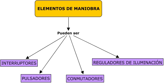 Este Cmap, tiene información relacionada con: Elementos de maniobra, ELEMENTOS DE MANIOBRA Pueden ser INTERRUPTORES, ELEMENTOS DE MANIOBRA Pueden ser PULSADORES, ELEMENTOS DE MANIOBRA Pueden ser CONMUTADORES, ELEMENTOS DE MANIOBRA Pueden ser REGULADORES DE ILUMINACIÓN