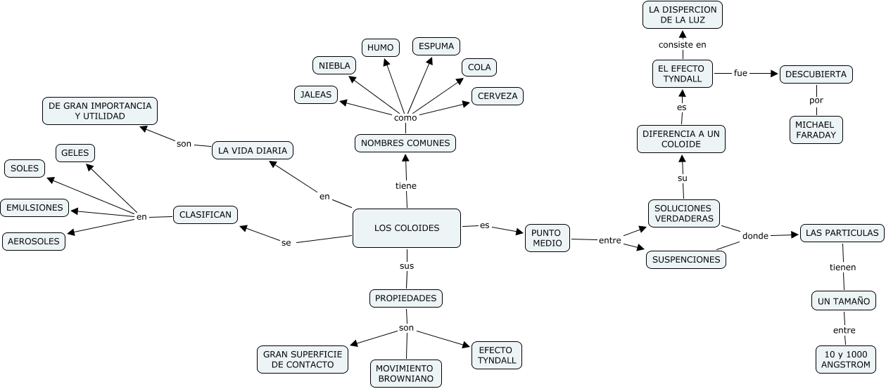 Este Cmap, tiene información relacionada con: los coloides TORETTO, LOS COLOIDES sus PROPIEDADES, PROPIEDADES son GRAN SUPERFICIE DE CONTACTO, SOLUCIONES VERDADERAS su DIFERENCIA A UN COLOIDE, LOS COLOIDES en LA VIDA DIARIA, LAS PARTICULAS tienen UN TAMAÑO, CLASIFICAN en EMULSIONES, PUNTO MEDIO entre SUSPENCIONES, SUSPENCIONES donde LAS PARTICULAS, NOMBRES COMUNES como HUMO, LA VIDA DIARIA son DE GRAN IMPORTANCIA Y UTILIDAD, EL EFECTO TYNDALL consiste en LA DISPERCION DE LA LUZ, LOS COLOIDES tiene NOMBRES COMUNES, NOMBRES COMUNES como ESPUMA, PROPIEDADES son MOVIMIENTO BROWNIANO, CLASIFICAN en GELES, NOMBRES COMUNES como COLA, SOLUCIONES VERDADERAS donde LAS PARTICULAS, NOMBRES COMUNES como CERVEZA, PUNTO MEDIO entre SOLUCIONES VERDADERAS, NOMBRES COMUNES como JALEAS
