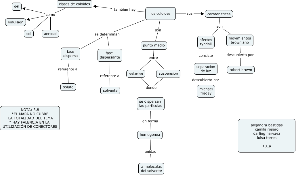 Este Cmap, tiene información relacionada con: coloides alejandra, los coloides tambien hay clases de coloides, movimientos browniano descubierto por robert brown, suspension donde se dispersan las particulas, los coloides se determinan fase dispersa, se dispersan las particulas en forma homogenea, separacion de luz descubierto por michael fraday, punto medio entre suspension, afectos tyndall consiste separacion de luz, solucion donde se dispersan las particulas, los coloides se determinan fase dispersante, fase dispersante referente a solvente, clases de coloides como aerosol, clases de coloides como sol, carateristicas son movimientos browniano, los coloides sus carateristicas, homogenea unidas a moleculas del solvente, carateristicas son afectos tyndall, clases de coloides como gel, clases de coloides como emulsion, fase dispersa referente a soluto