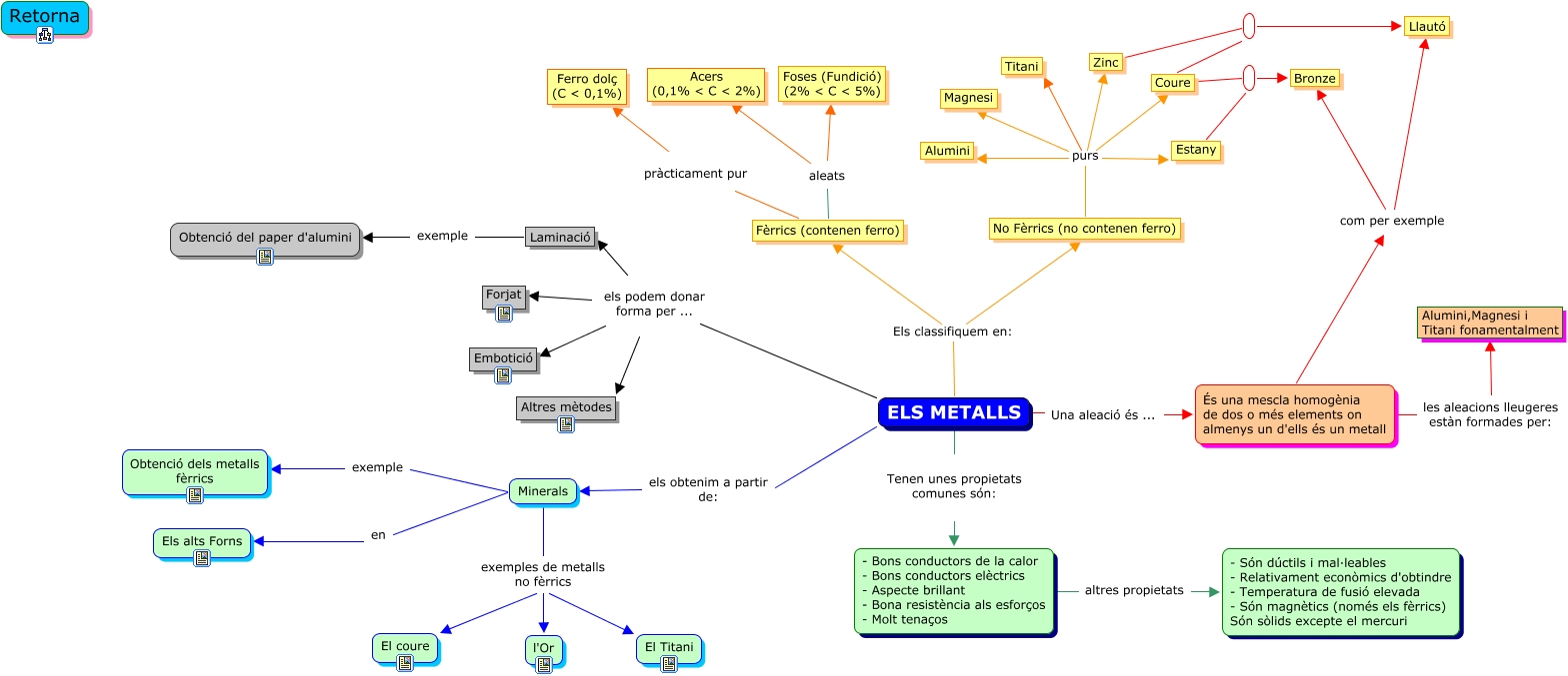 Aquest mapa conceptual conté informació relacionada amb: ElsMetalls_1ESO, Zinc Llautó, No Fèrrics (no contenen ferro) purs Titani, Minerals exemples de metalls no fèrrics El Titani, ELS METALLS els podem donar forma per ... Embotició, Minerals en Els alts Forns, No Fèrrics (no contenen ferro) purs Magnesi, No Fèrrics (no contenen ferro) purs Estany, ELS METALLS els podem donar forma per ... Altres mètodes, ELS METALLS Els classifiquem en: No Fèrrics (no contenen ferro), Fèrrics (contenen ferro) aleats Foses (Fundició) (2% < C < 5%), ELS METALLS els obtenim a partir de: Minerals, No Fèrrics (no contenen ferro) purs Zinc, No Fèrrics (no contenen ferro) purs Coure, Laminació exemple Obtenció del paper d'alumini, ELS METALLS els podem donar forma per ... Forjat, És una mescla homogènia de dos o més elements on almenys un d'ells és un metall com per exemple Bronze, - Bons conductors de la calor - Bons conductors elèctrics - Aspecte brillant - Bona resistència als esforços - Molt tenaços altres propietats - Són dúctils i mal·leables - Relativament econòmics d'obtindre - Temperatura de fusió elevada - Són magnètics (només els fèrrics) Són sòlids excepte el mercuri, ELS METALLS Tenen unes propietats comunes són: - Bons conductors de la calor - Bons conductors elèctrics - Aspecte brillant - Bona resistència als esforços - Molt tenaços, No Fèrrics (no contenen ferro) purs Alumini, Estany Bronze