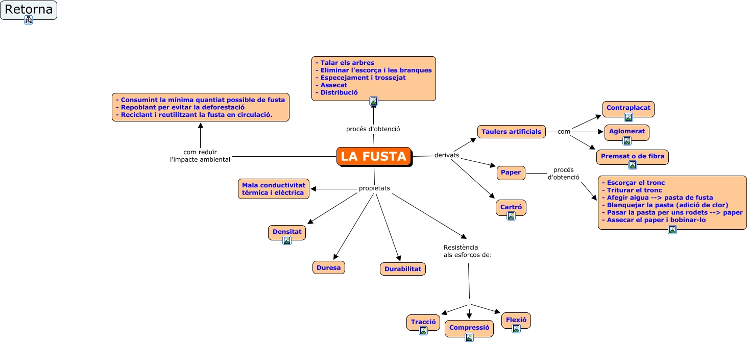 Aquest mapa conceptual conté informació relacionada amb: La Fusta 1r ESO, Taulers artificials com Premsat o de fibra, LA FUSTA com reduïr l'impacte ambiental - Consumint la mínima quantiat possible de fusta - Repoblant per evitar la deforestació - Reciclant i reutilitzant la fusta en circulació., Paper procés d'obtenció - Escorçar el tronc - Triturar el tronc - Afegir aigua --> pasta de fusta - Blanquejar la pasta (adició de clor) - Pasar la pasta per uns rodets --> paper - Assecar el paper i bobinar-lo, LA FUSTA propietats Resistència als esforços de:, LA FUSTA procés d'obtenció - Talar els arbres - Eliminar l'escorça i les branques - Especejament i trossejat - Assecat - Distribució, LA FUSTA propietats Durabilitat, Resistència als esforços de: Flexió, LA FUSTA propietats Mala conductivitat tèrmica i elèctrica, LA FUSTA derivats Cartró, LA FUSTA propietats Duresa, LA FUSTA propietats Densitat, Resistència als esforços de: Compressió, LA FUSTA derivats Paper, LA FUSTA derivats Taulers artificials, Resistència als esforços de: Tracció, Taulers artificials com Aglomerat, Taulers artificials com Contraplacat