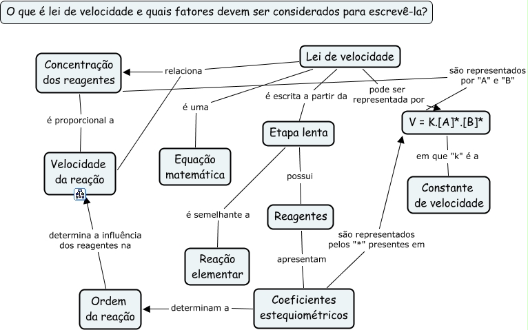 Esse mapa conceitual, produzido no IHMC CmapTools, tem a informação relacionada a: Velocidade II 2A, Coeficientes estequiométricos são representados pelos "*" presentes em V = K.[A]*.[B]*, V = K.[A]*.[B]* em que "k" é a Constante de velocidade, Lei de velocidade pode ser representada por V = K.[A]*.[B]*, Ordem da reação determina a influência dos reagentes na Velocidade da reação, Lei de velocidade é uma Equação matemática, Lei de velocidade relaciona Velocidade da reação, Concentração dos reagentes são representados por "A" e "B" V = K.[A]*.[B]*, Reagentes apresentam Coeficientes estequiométricos, Etapa lenta possui Reagentes, Lei de velocidade relaciona Concentração dos reagentes, Coeficientes estequiométricos determinam a Ordem da reação, Etapa lenta é semelhante a Reação elementar, Concentração dos reagentes é proporcional a Velocidade da reação, Lei de velocidade é escrita a partir da Etapa lenta