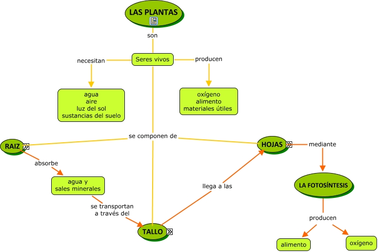 Este Cmap, tiene información relacionada con: las plantas, LA FOTOSÍNTESIS producen alimento, TALLO llega a las HOJAS, RAÍZ crece bajo tierra, HOJAS mediante LA FOTOSÍNTESIS, Seres vivos se componen de HOJAS, RAÍZ se ramifica, HOJAS se componen de peciolo, HOJAS se componen de limbo, RAÍZ absorbe mediante los pelos radicales, Seres vivos necesitan agua aire luz del sol sustancias del suelo, Seres vivos se componen de TALLO, LAS PLANTAS son Seres vivos, Seres vivos producen oxígeno alimento materiales útiles, TALLO sostiene hojas flores frutos, TALLO pueden ser leñosos: duros y rígidos formados por madera, agua y sales minerales se transportan a través del TALLO, TALLO suele dividirse en ramas, LA FOTOSÍNTESIS producen oxígeno, TALLO pueden ser herbáceos: blandos, flexiblesy verdes, Seres vivos se componen de RAÍZ