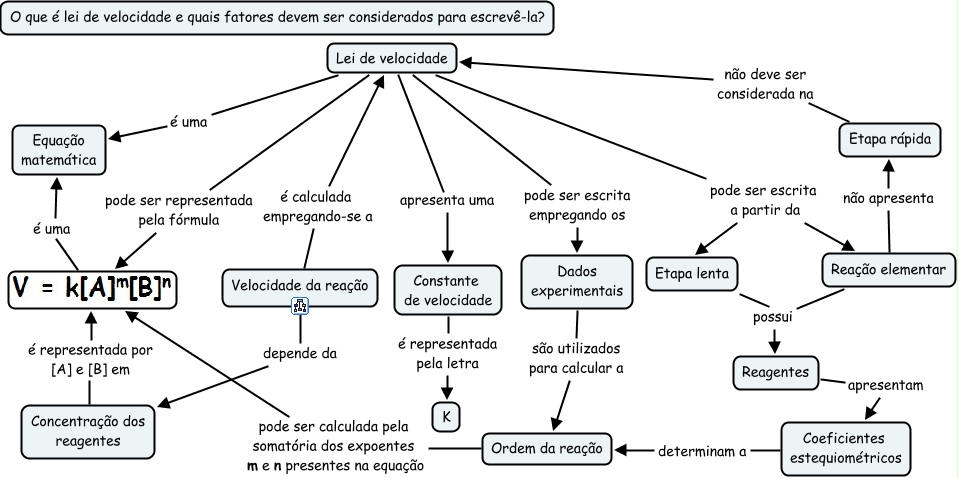 This Concept Map, created with IHMC CmapTools, has information related to: Velocidade IV 2C, Lei de velocidade é uma Equação matemática, Ordem da reação pode ser calculada pela somatória dos expoentes m e n presentes na equação, Lei de velocidade pode ser escrita a partir da Reação elementar, Concentração dos reagentes é representada por [A] e [B] em, Velocidade da reação depende da Concentração dos reagentes, Reagentes apresentam Coeficientes estequiométricos, Etapa lenta possui Reagentes, é uma Equação matemática, Reação elementar possui Reagentes, Coeficientes estequiométricos determinam a Ordem da reação, Dados experimentais são utilizados para calcular a Ordem da reação, Lei de velocidade pode ser escrita empregando os Dados experimentais, Lei de velocidade apresenta uma Constante de velocidade, Reação elementar não apresenta Etapa rápida, Lei de velocidade pode ser escrita a partir da Etapa lenta, Constante de velocidade é representada pela letra K, Etapa rápida não deve ser considerada na Lei de velocidade, Velocidade da reação é calculada empregando-se a Lei de velocidade, Lei de velocidade pode ser representada pela fórmula