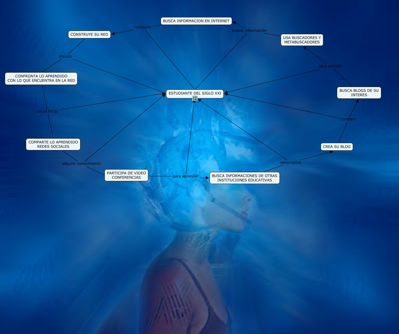 Este Cmap, tiene información relacionada con: ESTUDIANTE DEL SIGLO XXI, COMPARTE LO APRENDIDO REDES SOCIALES adquirir conocimiento PARTICIPA DE VIDEO CONFERENCIAS, BUSCA BLOGS DE SU INTERES para acceder ESTUDIANTE DEL SIGLO XXI, CREA SU BLOG compara BUSCA BLOGS DE SU INTERES, USA BUSCADORES Y METABUSCADORES buscar información BUSCA INFORMACION EN INTERNET, USA BUSCADORES Y METABUSCADORES buscar información ESTUDIANTE DEL SIGLO XXI, BUSCA BLOGS DE SU INTERES para acceder USA BUSCADORES Y METABUSCADORES, BUSCA INFORMACIONES DE OTRAS INSTITUCIONES EDUCATIVAS sistematiza ESTUDIANTE DEL SIGLO XXI, COMPARTE LO APRENDIDO REDES SOCIALES adquirir conocimiento ESTUDIANTE DEL SIGLO XXI, CONFRONTA LO APRENDIDO CON LO QUE ENCUENTRA EN LA RED con el fin de ESTUDIANTE DEL SIGLO XXI, BUSCA INFORMACION EN INTERNET compartir CONSTRUYE SU RED, CONSTRUYE SU RED discute ESTUDIANTE DEL SIGLO XXI, CONSTRUYE SU RED discute CONFRONTA LO APRENDIDO CON LO QUE ENCUENTRA EN LA RED, BUSCA INFORMACIONES DE OTRAS INSTITUCIONES EDUCATIVAS sistematiza CREA SU BLOG, BUSCA INFORMACION EN INTERNET compartir ESTUDIANTE DEL SIGLO XXI, CREA SU BLOG compara ESTUDIANTE DEL SIGLO XXI, CONFRONTA LO APRENDIDO CON LO QUE ENCUENTRA EN LA RED con el fin de COMPARTE LO APRENDIDO REDES SOCIALES, PARTICIPA DE VIDEO CONFERENCIAS para aprender BUSCA INFORMACIONES DE OTRAS INSTITUCIONES EDUCATIVAS, PARTICIPA DE VIDEO CONFERENCIAS para aprender ESTUDIANTE DEL SIGLO XXI