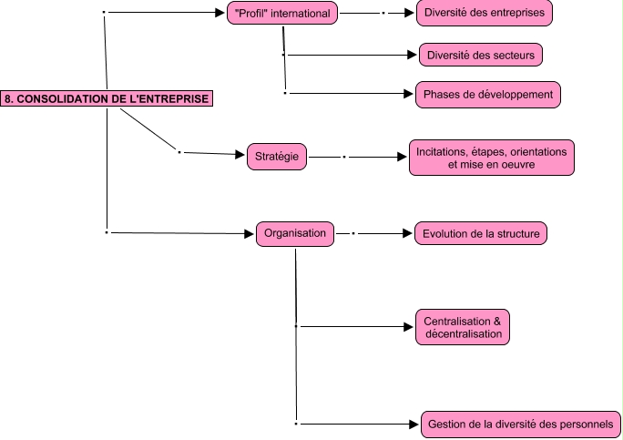 Cette carte de concepts créée avec IHMC CmapTools traite de: Consolidation, 8. CONSOLIDATION DE L'ENTREPRISE . Organisation, "Profil" international . Diversité des entreprises, "Profil" international . Diversité des secteurs, Organisation . Gestion de la diversité des personnels, 8. CONSOLIDATION DE L'ENTREPRISE . Stratégie, Organisation . Evolution de la structure, Stratégie . Incitations, étapes, orientations et mise en oeuvre, 8. CONSOLIDATION DE L'ENTREPRISE . "Profil" international, Organisation . Centralisation & décentralisation, "Profil" international . Phases de développement