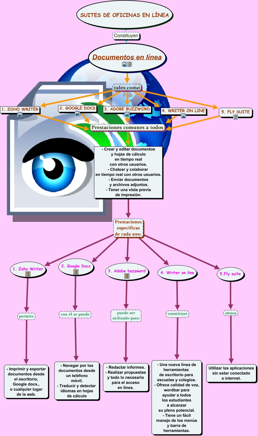 Este Cmap, tiene información relacionada con: Documentos en línea, - Crear y editar documentos y hojas de cálculo en tiempo real con otros usuarios. - Chatear y colaborar en tiempo real con otros usuarios. - Enviar documentos y archivos adjuntos. - Tener una vista previa de impresión. Prestaciones específicas de cada uno. 1. Zoho Writer, 3. ADOBE BUZZWORD Prestaciones comunes a todos - Crear y editar documentos y hojas de cálculo en tiempo real con otros usuarios. - Chatear y colaborar en tiempo real con otros usuarios. - Enviar documentos y archivos adjuntos. - Tener una vista previa de impresión., 1. ZOHO WRITER Prestaciones comunes a todos - Crear y editar documentos y hojas de cálculo en tiempo real con otros usuarios. - Chatear y colaborar en tiempo real con otros usuarios. - Enviar documentos y archivos adjuntos. - Tener una vista previa de impresión., 2. GOOGLE DOCS Prestaciones comunes a todos - Crear y editar documentos y hojas de cálculo en tiempo real con otros usuarios. - Chatear y colaborar en tiempo real con otros usuarios. - Enviar documentos y archivos adjuntos. - Tener una vista previa de impresión., - Crear y editar documentos y hojas de cálculo en tiempo real con otros usuarios. - Chatear y colaborar en tiempo real con otros usuarios. - Enviar documentos y archivos adjuntos. - Tener una vista previa de impresión. Prestaciones específicas de cada uno. 5.Fly suite, 5. FLY SUITE Prestaciones comunes a todos - Crear y editar documentos y hojas de cálculo en tiempo real con otros usuarios. - Chatear y colaborar en tiempo real con otros usuarios. - Enviar documentos y archivos adjuntos. - Tener una vista previa de impresión., 4. Writer on line constituye - Una nueva línea de herramientas de escritorio para escuelas y colegios. - Ofrece calidad de voz, wordbar para ayudar a todos los estudiantes a alcanzar su pleno potencial. - Tiene un fácil manejo de los menús y barra de herramientas., SUITES DE OFICINAS EN LÍNEA Constituyen Documentos en línea, 3. ADOBE BUZZWORD Prestaciones comunes a todos - Crear y editar documentos y hojas de cálculo en tiempo real con otros usuarios. - Chatear y colaborar en tiempo real con otros usuarios. - Enviar documentos y archivos adjuntos. - Tener una vista previa de impresión., 4. WRITER ON LINE Prestaciones comunes a todos - Crear y editar documentos y hojas de cálculo en tiempo real con otros usuarios. - Chatear y colaborar en tiempo real con otros usuarios. - Enviar documentos y archivos adjuntos. - Tener una vista previa de impresión., 4. WRITER ON LINE Prestaciones comunes a todos - Crear y editar documentos y hojas de cálculo en tiempo real con otros usuarios. - Chatear y colaborar en tiempo real con otros usuarios. - Enviar documentos y archivos adjuntos. - Tener una vista previa de impresión., Documentos en línea tales como 4. WRITER ON LINE, 5. FLY SUITE Prestaciones comunes a todos - Crear y editar documentos y hojas de cálculo en tiempo real con otros usuarios. - Chatear y colaborar en tiempo real con otros usuarios. - Enviar documentos y archivos adjuntos. - Tener una vista previa de impresión., Documentos en línea tales como 1. ZOHO WRITER, 3. Adobe buzzword puede ser utilizado para: - Redactar informes. - Realizar propuestas y todo lo necesario para el acceso en línea., 2. Google Docs con él se puede - Navegar por los documentos desde un teléfono móvil. - Traducir y detectar idiomas en hojas de cálculo, 5.Fly suite ofrece Utilizar las aplicaciones sin estar conectado a internet., 3. ADOBE BUZZWORD Prestaciones comunes a todos - Crear y editar documentos y hojas de cálculo en tiempo real con otros usuarios. - Chatear y colaborar en tiempo real con otros usuarios. - Enviar documentos y archivos adjuntos. - Tener una vista previa de impresión., 2. GOOGLE DOCS Prestaciones comunes a todos - Crear y editar documentos y hojas de cálculo en tiempo real con otros usuarios. - Chatear y colaborar en tiempo real con otros usuarios. - Enviar documentos y archivos adjuntos. - Tener una vista previa de impresión., 1. ZOHO WRITER Prestaciones comunes a todos - Crear y editar documentos y hojas de cálculo en tiempo real con otros usuarios. - Chatear y colaborar en tiempo real con otros usuarios. - Enviar documentos y archivos adjuntos. - Tener una vista previa de impresión.