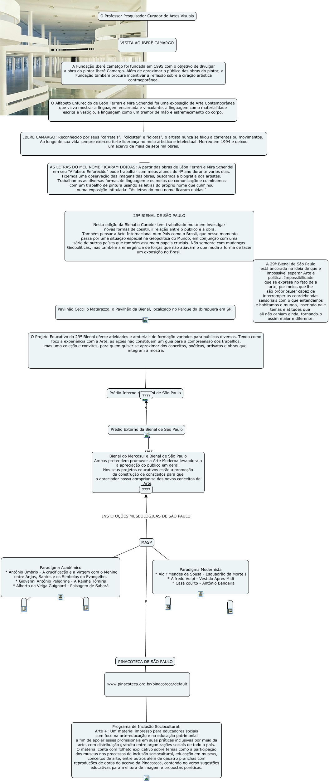 Esse mapa conceitual, produzido no IHMC CmapTools, tem a informação relacionada a: O professor pesquisador curador de Artes Visuais, MASP ???? Paradígma Acadêmico * Antônio Úmbrio - A crucificação e a Virgem com o Menino entre Anjos, Santos e os Símbolos do Evangelho. * Giovanni Antônio Pelegrine - A Rainha Tômiris * Alberto da Veiga Guignard - Paisagem de Sabará, ???? Paradígma Acadêmico * Antônio Úmbrio - A crucificação e a Virgem com o Menino entre Anjos, Santos e os Símbolos do Evangelho. * Giovanni Antônio Pelegrine - A Rainha Tômiris * Alberto da Veiga Guignard - Paisagem de Sabará, MASP ???? Paradigma Modernista * Aldir Mendes de Sousa - Esquadrão da Morte I * Alfredo Volpi - Vestido Aprés Midi * Casa courto - Antônio Bandeira, PINACOTECA DE SÃO PAULO ???? Programa de Inclusão Sociocultural: Arte +: Um material impresso para educadores sociais com foco na arte-educação e na educação patrimonial a fim de apoiar esses profissionais em suas práticas inclusivas por meio da arte, com distribuição gratuita entre organizações sociais de todo o país. O material conta com folheto explicativo sobre temas como a participação dos museus nos processos de inclusão sociocultural, educação em museus, conceitos de arte, entre outros além de qauatro pranchas com reproduções de obras do acervo da Pinacoteca, contendo no verso sugestões educativas para a elitura de imagem e propostas poréticas., VISITA AO IBERÊ CAMARGO A Fundação Iberê camatgo foi fundada em 1995 com o objetivo de divulgar a obra do pintor Iberê Camargo. Além de aproximar o público das obras do pintor, a Fundação também procura incentivar a reflexão sobre a ciração artística contmeporânea., O Alfabeto Enfurecido de León Ferrari e Mira Schendel foi uma exposição de Arte Contemporânea que visva mostrar a linguagem encarnada e vinculante, a linguagem como materialidade escrita e vestígio, a linguagem como um tremor de mão e estremecimento do corpo. ???? IBERÊ CAMARGO: Reconhecido por seus "carreteis", 'cilcistas" e "idiotas", o artista nunca se filiou a correntes ou movimentos. Ao longo de sua vida sempre exerceu forte liderança no meio artístico e intelectual. Morreu em 1994 e deixou um acervo de mais de sete mil obras., O Professor Pesquisador Curador de Artes Visuais ???? VISITA AO IBERÊ CAMARGO, Prédio Interno da Bienal de São Paulo ???? O Projeto Educativo da 29ª Bienal oferce atividades e amteriais de formação variados para públicos diversos. Tendo como foco a experiência com a Arte, as ações não constituem um guia para a compreensão dos trabalhos, mas uma coleção e convites, para quem quiser se aproximar dos conceitos, poéticas, artisatas e obras que integram a mostra., A Fundação Iberê camatgo foi fundada em 1995 com o objetivo de divulgar a obra do pintor Iberê Camargo. Além de aproximar o público das obras do pintor, a Fundação também procura incentivar a reflexão sobre a ciração artística contmeporânea. O Alfabeto Enfurecido de León Ferrari e Mira Schendel foi uma exposição de Arte Contemporânea que visva mostrar a linguagem encarnada e vinculante, a linguagem como materialidade escrita e vestígio, a linguagem como um tremor de mão e estremecimento do corpo., PINACOTECA DE SÃO PAULO www.pinacoteca.org.br/pinacoteca/default, Prédio Externo da Bienal de São Paulo e ????, Bienal do Mercosul e Bienal de São Paulo Ambas pretendem promover a Arte Moderna levando-a a a apreciação do público em geral. Nos seus projetos educativos estão a promoção da construção de consceitos para que o apreciador possa apropriar-se dos novos conceitos de Arte. ???? ????, MASP INSTITUÇÕES MUSEOLÓGICAS DE SÃO PAULO ????, ???? Paradígma Acadêmico * Antônio Úmbrio - A crucificação e a Virgem com o Menino entre Anjos, Santos e os Símbolos do Evangelho. * Giovanni Antônio Pelegrine - A Rainha Tômiris * Alberto da Veiga Guignard - Paisagem de Sabará, MASP E PINACOTECA DE SÃO PAULO