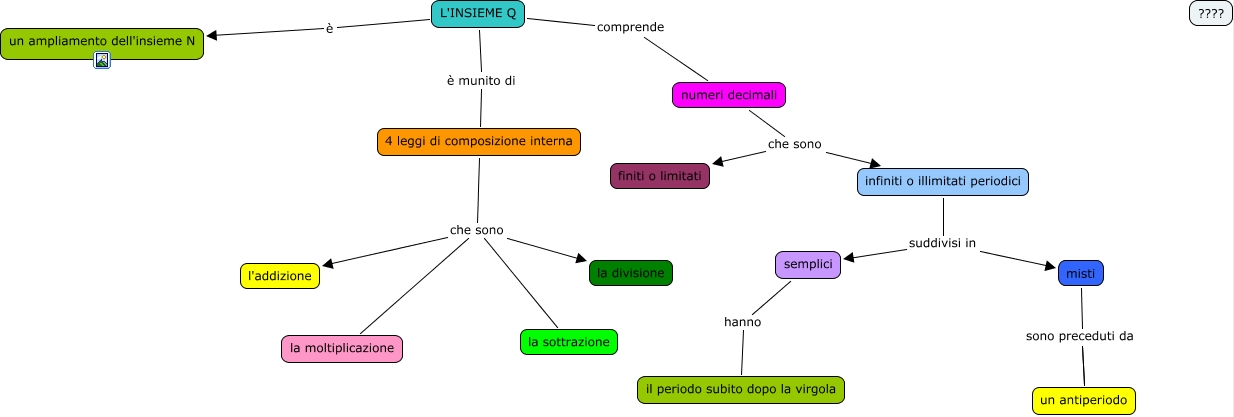 Questa Cmap, creata con IHMC CmapTools, contiene informazioni relative a: insieme Q, 4 leggi di composizione interna che sono la moltiplicazione, infiniti o illimitati periodici suddivisi in misti, infiniti o illimitati periodici suddivisi in semplici, misti sono preceduti da un antiperiodo, semplici hanno il periodo subito dopo la virgola, 4 leggi di composizione interna che sono la divisione, L'INSIEME Q comprende numeri decimali, L'INSIEME Q è munito di 4 leggi di composizione interna, misti sono preceduti da un antiperiodo, 4 leggi di composizione interna che sono la sottrazione, numeri decimali che sono finiti o limitati, numeri decimali che sono infiniti o illimitati periodici, L'INSIEME Q è un ampliamento dell'insieme N, 4 leggi di composizione interna che sono l'addizione