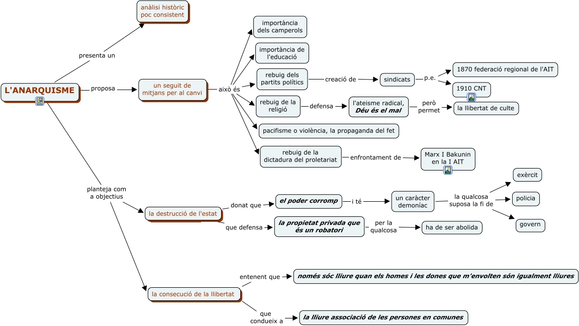 Aquest mapa conceptual conté informació relacionada amb: L'anarquisme, el poder corromp i té un caràcter demoníac, sindicats p.e. 1910 CNT, la propietat privada que és un robatori per la qualcosa ha de ser abolida, un caràcter demoníac la qualcosa suposa la fi de policia, la consecució de la llibertat que condueix a la lliure associació de les persones en comunes, la destrucció de l'estat donat que el poder corromp, un seguit de mitjans per al canvi això és importància dels camperols, rebuig de la dictadura del proletariat enfrontament de Marx I Bakunin en la I AIT, un seguit de mitjans per al canvi això és rebuig de la religió, L'ANARQUISME presenta un anàlisi històric poc consistent, un seguit de mitjans per al canvi això és rebuig dels partits polítics, L'ANARQUISME planteja com a objectius la consecució de la llibertat, la consecució de la llibertat entenent que només sóc lliure quan els homes i les dones que m'envolten són igualment lliures, rebuig dels partits polítics creació de sindicats, l'ateisme radical, Déu és el mal però permet la llibertat de culte, un seguit de mitjans per al canvi això és rebuig de la dictadura del proletariat, un caràcter demoníac la qualcosa suposa la fi de govern, L'ANARQUISME proposa un seguit de mitjans per al canvi, un seguit de mitjans per al canvi això és pacifisme o violència, la propaganda del fet, rebuig de la religió defensa l'ateisme radical, Déu és el mal