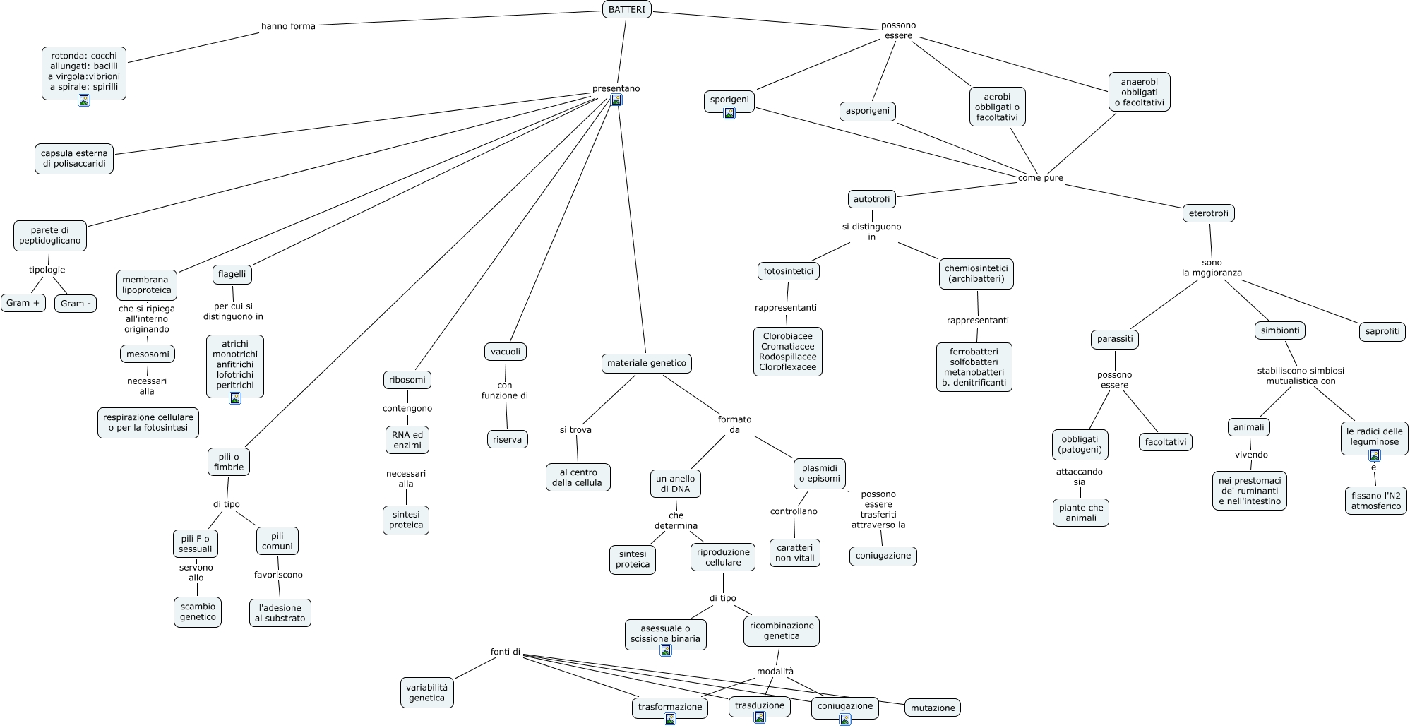 Questa Cmap, creata con IHMC CmapTools, contiene informazioni relative a: 04.1 I Batteri, coniugazione fonti di variabilità genetica, un anello di DNA che determina sintesi proteica, pili F o sessuali servono allo scambio genetico, BATTERI possono essere asporigeni, ribosomi contengono RNA ed enzimi, mutazione fonti di variabilità genetica, pili o fimbrie presentano vacuoli, capsula esterna di polisaccaridi presentano membrana lipoproteica, capsula esterna di polisaccaridi presentano ribosomi, BATTERI presentano vacuoli, plasmidi o episomi controllano caratteri non vitali, fotosintetici rappresentanti Clorobiacee Cromatiacee Rodospillacee Cloroflexacee, parassiti possono essere obbligati (patogeni), trasformazione modalità trasduzione, plasmidi o episomi possono essere trasferiti attraverso la coniugazione, autotrofi si distinguono in fotosintetici, obbligati (patogeni) attaccando sia piante che animali, capsula esterna di polisaccaridi presentano flagelli, aerobi obbligati o facoltativi come pure autotrofi, BATTERI presentano membrana lipoproteica