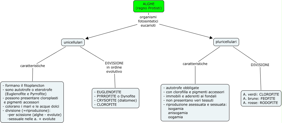 Questa Cmap, creata con IHMC CmapTools, contiene informazioni relative a: 07 Le alghe, pluricellulari DIVISIONI A. verdi: CLOROFITE A. brune: FEOFITE A. rosse: RODOFITE, ALGHE (regno Protisti) organismi fotosintetici eucarioti pluricellulari, ALGHE (regno Protisti) organismi fotosintetici eucarioti unicellulari, unicellulari DIVISIONI in ordine evolutivo - EUGLENOFITE - PYRROFITE o Dynofite - CRYSOFITE (diatomee) - CLOROFITE, unicellulari caratteristiche - formano il fitoplancton - sono autotrofe o eterotrofe (Euglenofite e Pyrrofite) - possono presentare cloroplasti e pigmenti accessori - colorano i mari e le acque dolci - divisione (=riproduzione): -per scissione (alghe - evolute) -sessuale nelle a. + evolute, pluricellulari caratteristiche - autotrofe obbligate - con clorofilla e pigmenti accessori - immobili e aderenti ai fondali - non presentano veri tessuti - riproduzione asessuata e sessuata: isogamia anisogamia oogamia