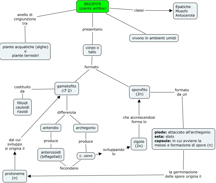 Questa Cmap, creata con IHMC CmapTools, contiene informazioni relative a: 09 Le Briofite, anterozoidi (biflagellati) fecondano c. uovo, corpo o tallo formato gametofito (♂ ♀), anteridio produce anterozoidi (biflagellati), sporofito (2n) formato da un piede: attaccato all'archegonio seta: stelo capsula: in cui avviene la meiosi e formazione di spore (n), BRIOFITE (piante anfibie) presentano corpo o tallo, BRIOFITE (piante anfibie) classi Epatiche Muschi Antocerote, gametofito (♂ ♀) differenzia archegonio, protonema (n) dal cui sviluppo si origina il gametofito (♂ ♀), gametofito (♂ ♀) differenzia anteridio, archegonio produce c. uovo, BRIOFITE (piante anfibie) anello di cingiunzione tra piante acquatiche (alghe) e piante terrestri, zigote (2n) che accrescendosi forma lo sporofito (2n), corpo o tallo formato sporofito (2n), BRIOFITE (piante anfibie) vivono in ambienti umidi, gametofito (♂ ♀) costituito da filloidi cauloidi rizoidi, piede: attaccato all'archegonio seta: stelo capsula: in cui avviene la meiosi e formazione di spore (n) la germinazione delle spore origina il protonema (n), c. uovo sviluppando lo zigote (2n)