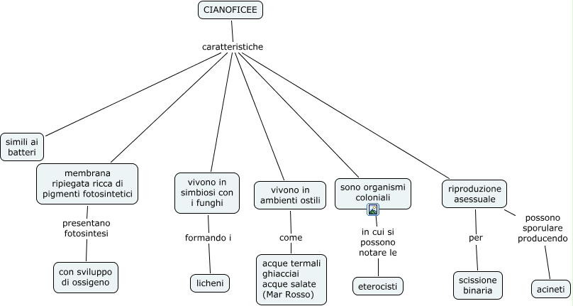 Questa Cmap, creata con IHMC CmapTools, contiene informazioni relative a: 04.2 Le Cianoficee, CIANOFICEE caratteristiche membrana ripiegata ricca di pigmenti fotosintetici, vivono in simbiosi con i funghi formando i licheni, membrana ripiegata ricca di pigmenti fotosintetici presentano fotosintesi con sviluppo di ossigeno, CIANOFICEE caratteristiche riproduzione asessuale, CIANOFICEE caratteristiche vivono in simbiosi con i funghi, riproduzione asessuale per scissione binaria, CIANOFICEE caratteristiche vivono in ambienti ostili, riproduzione asessuale possono sporulare producendo acineti, sono organismi coloniali in cui si possono notare le eterocisti, vivono in ambienti ostili come acque termali ghiacciai acque salate (Mar Rosso), CIANOFICEE caratteristiche sono organismi coloniali, CIANOFICEE caratteristiche simili ai batteri