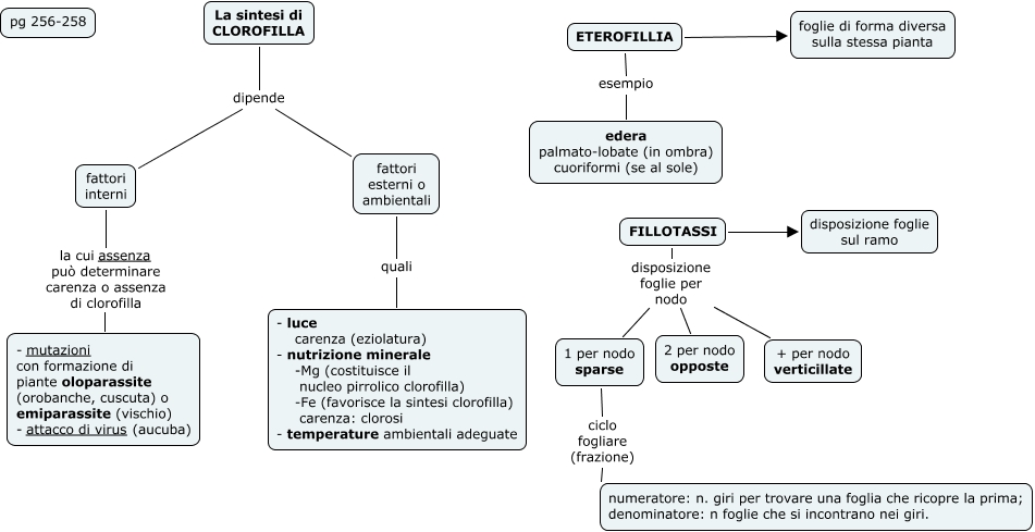 Questa Cmap, creata con IHMC CmapTools, contiene informazioni relative a: 12.1 Sintesi clorofilla, fattori esterni o ambientali quali - luce carenza (eziolatura) - nutrizione minerale -Mg (costituisce il nucleo pirrolico clorofilla) -Fe (favorisce la sintesi clorofilla) carenza: clorosi - temperature ambientali adeguate, ETEROFILLIA foglie di forma diversa sulla stessa pianta, 1 per nodo sparse ciclo fogliare (frazione) numeratore: n. giri per trovare una foglia che ricopre la prima; denominatore: n foglie che si incontrano nei giri., La sintesi di CLOROFILLA dipende fattori interni, ETEROFILLIA esempio edera palmato-lobate (in ombra) cuoriformi (se al sole), FILLOTASSI disposizione foglie per nodo 1 per nodo sparse, FILLOTASSI disposizione foglie per nodo 2 per nodo opposte, FILLOTASSI disposizione foglie per nodo + per nodo verticillate, fattori interni la cui assenza può determinare carenza o assenza di clorofilla - mutazioni con formazione di piante oloparassite (orobanche, cuscuta) o emiparassite (vischio) - attacco di virus (aucuba), La sintesi di CLOROFILLA dipende fattori esterni o ambientali, FILLOTASSI disposizione foglie sul ramo