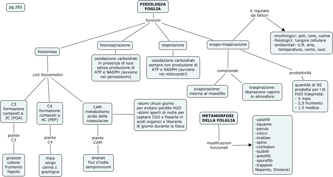 Questa Cmap, creata con IHMC CmapTools, contiene informazioni relative a: 12.3 Fisiologia foglia, C4 formazione composti a 4C (PEP) piante C4 mais sorgo canna z. gramigna, CAM metabolismo acido delle crassulacee -stomi chiusi giorno per evitare perdite H2O -stomi aperti di notte per captare CO2 e fissarla in acidi organici e liberarla di giorno durante la fotos, C3 formazione composti a 3C (PGA) piante C3 girasole cotone frumento fagiolo, evapo-traspirazione comprende evaporazione: interna al mesofillo, FISIOLOGIA FOGLIA funzioni fotorespirazione, respirazione ossidazione carboidrati sempre con produzione di ATP e NADPH (avviene nei mitocondri), fotosintesi funzioni fotorespirazione, evapo-traspirazione è regolata da fattori -morfologici: peli, cere, cutina -fisiologici: turgore cellulare -ambientali: U.R. aria, temperatura, vento, luce, evapo-traspirazione funzioni respirazione, evapo-traspirazione funzioni fotorespirazione, fotosintesi funzioni respirazione, evapo-traspirazione produttività quantità di SS prodotta per l di H2O traspirata: - 4 mais - 2,5 frumento - 1,5 medica, evapo-traspirazione comprende traspirazione: liberazione vapore in atmosfera, CAM metabolismo acido delle crassulacee piante CAM ananas fico d'india semprevivum, fotosintesi cicli fotosintetici C4 formazione composti a 4C (PEP), METAMORFOSI DELLA FOLGLIA modificazioni funzionali -catafilli -squame -perule -viticci -brattee -spine -cotiledoni -bulbilli -antofilli -sporofilli -trappole Nepente, Drosera), fotorespirazione ossidazione carboidrati in presenza di luce senza produzione di ATP e NADPH (avviene nei perossisomi), fotosintesi cicli fotosintetici C3 formazione composti a 3C (PGA), fotosintesi cicli fotosintetici CAM metabolismo acido delle crassulacee, FISIOLOGIA FOGLIA funzioni respirazione
