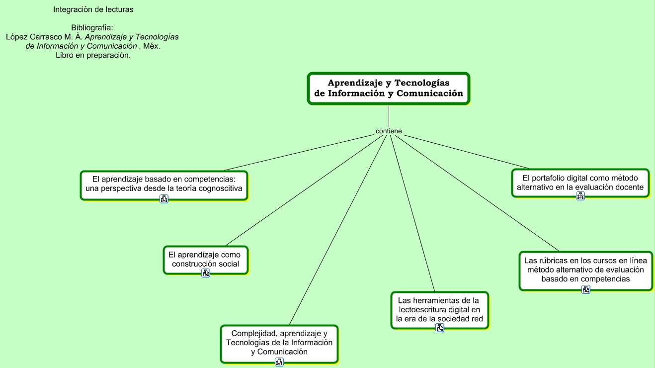 Este Cmap, tiene información relacionada con: Aprendizaje y TIC, Aprendizaje y Tecnologías de Información y Comunicación contiene El aprendizaje como construcción social, Aprendizaje y Tecnologías de Información y Comunicación contiene Complejidad, aprendizaje y Tecnologías de la Información y Comunicación, Aprendizaje y Tecnologías de Información y Comunicación contiene Las herramientas de la lectoescritura digital en la era de la sociedad red, Aprendizaje y Tecnologías de Información y Comunicación contiene Las rúbricas en los cursos en línea método alternativo de evaluación basado en competencias, Aprendizaje y Tecnologías de Información y Comunicación contiene El portafolio digital como método alternativo en la evaluación docente, Aprendizaje y Tecnologías de Información y Comunicación contiene El aprendizaje basado en competencias: una perspectiva desde la teoría cognoscitiva