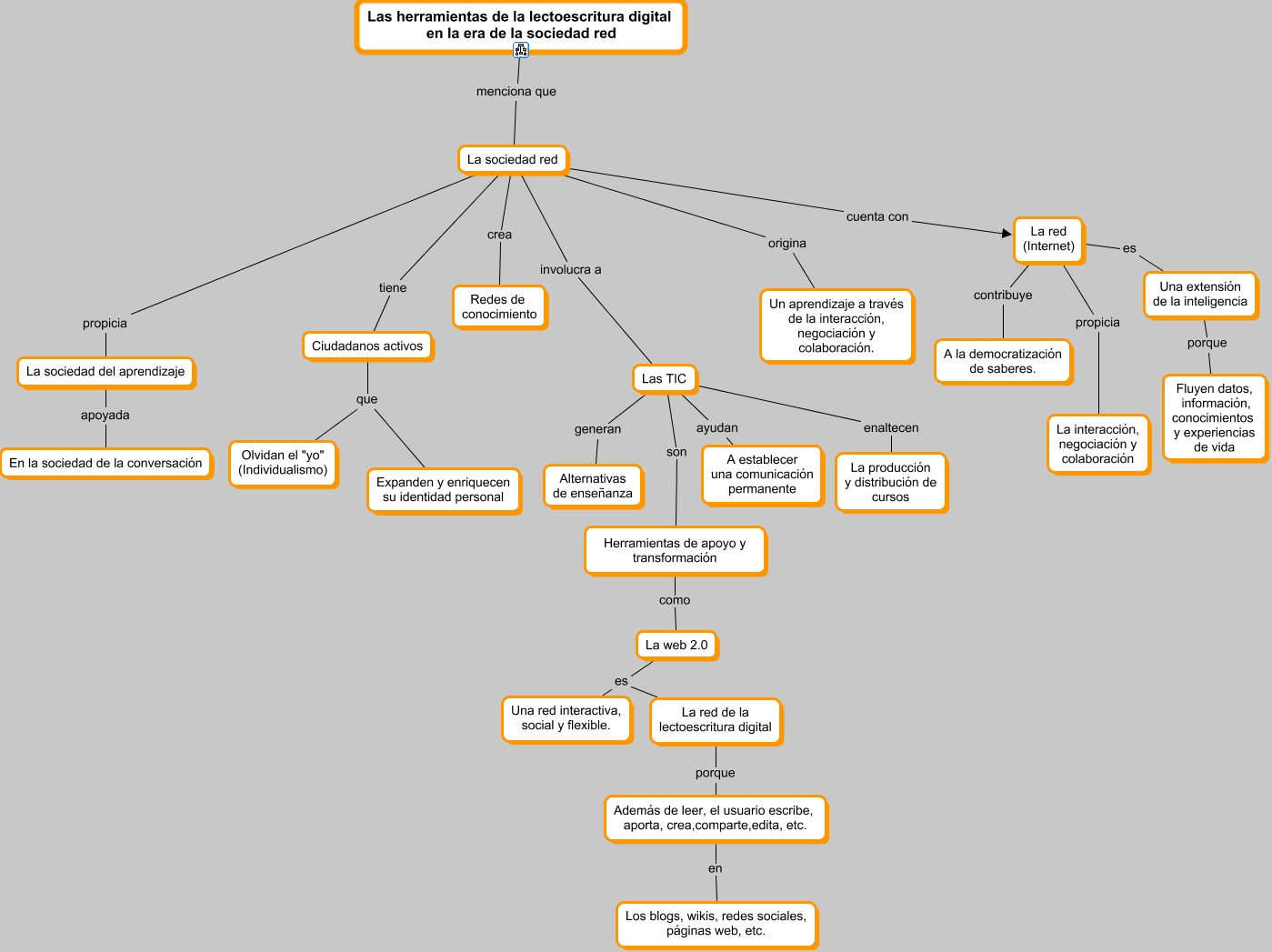 Este Cmap, tiene información relacionada con: Las herramientas de la lectoescritura digital, Ciudadanos activos que Olvidan el "yo" (Individualismo), La sociedad red tiene Ciudadanos activos, Las TIC son Herramientas de apoyo y transformación, Una extensión de la inteligencia porque Fluyen datos, información, conocimientos y experiencias de vida, La red de la lectoescritura digital porque Además de leer, el usuario escribe, aporta, crea,comparte,edita, etc., Ciudadanos activos que Expanden y enriquecen su identidad personal, La red (Internet) contribuye A la democratización de saberes., La web 2.0 es Una red interactiva, social y flexible., La sociedad red cuenta con La red (Internet), La sociedad red involucra a Las TIC, La red (Internet) es Una extensión de la inteligencia, La sociedad red propicia La sociedad del aprendizaje, La sociedad del aprendizaje apoyada En la sociedad de la conversación, Las TIC enaltecen La producción y distribución de cursos, La sociedad red crea Redes de conocimiento, La sociedad red origina Un aprendizaje a través de la interacción, negociación y colaboración., Las herramientas de la lectoescritura digital en la era de la sociedad red menciona que La sociedad red, Las TIC ayudan A establecer una comunicación permanente, La red (Internet) propicia La interacción, negociación y colaboración, La web 2.0 es La red de la lectoescritura digital