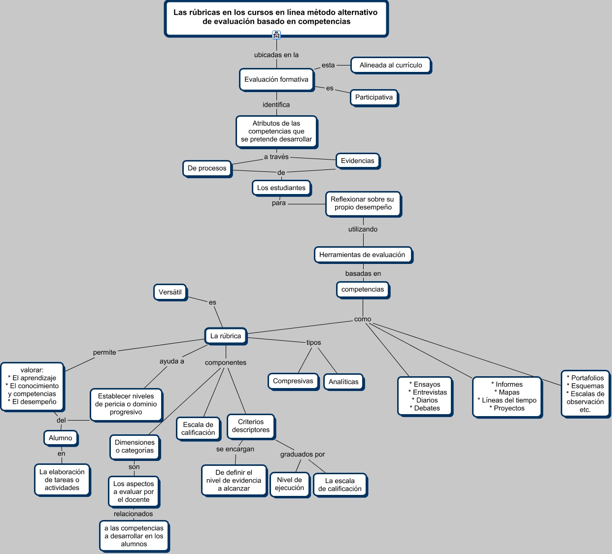 Este Cmap, tiene información relacionada con: Las rúbricas, Los estudiantes para Reflexionar sobre su propio desempeño, La rúbrica es Versátil, competencias como * Portafolios * Esquemas * Escalas de observación etc., La rúbrica permite valorar: * El aprendizaje * El conocimiento y competencias * El desempeño, Los aspectos a evaluar por el docente relacionados a las competencias a desarrollar en los alumnos, La rúbrica componentes Criterios descriptores, Criterios descriptores graduados por La escala de calificación, De procesos de Los estudiantes, Criterios descriptores graduados por Nivel de ejecución, La rúbrica componentes Dimensiones o categorías, Alumno en La elaboración de tareas o actividades, competencias como * Ensayos * Entrevistas * Diarios * Debates, Evaluación formativa identifica Atributos de las competencias que se pretende desarrollar, valorar: * El aprendizaje * El conocimiento y competencias * El desempeño del Alumno, Evaluación formativa es Participativa, Herramientas de evaluación basadas en competencias, La rúbrica tipos Analíticas, Las rúbricas en los cursos en línea método alternativo de evaluación basado en competencias ubicadas en la Evaluación formativa, competencias como La rúbrica, La rúbrica ayuda a Establecer niveles de pericia o dominio progresivo
