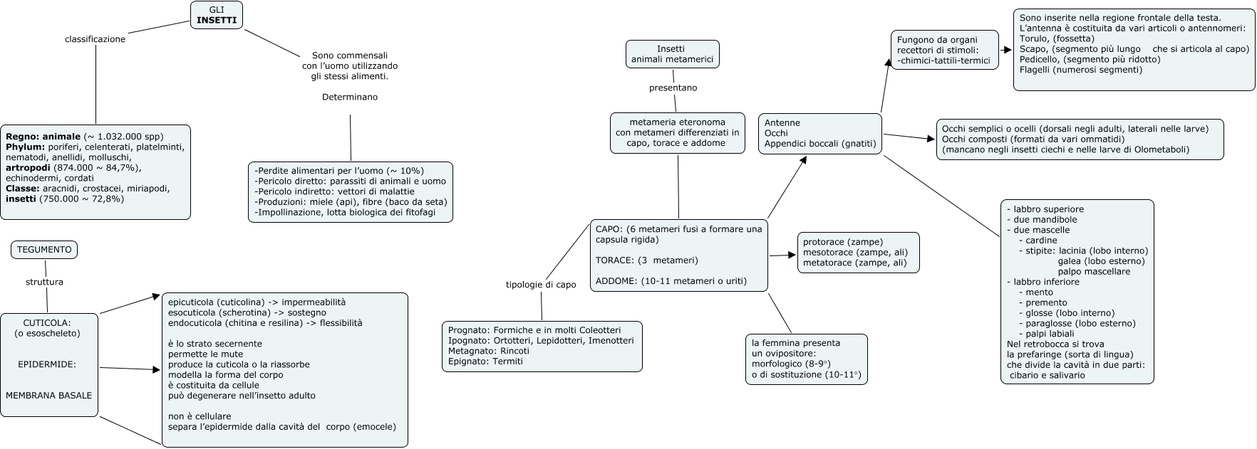 Questa Cmap, creata con IHMC CmapTools, contiene informazioni relative a: 01 Insetti, CAPO: (6 metameri fusi a formare una capsula rigida) TORACE: (3 metameri) ADDOME: (10-11 metameri o uriti) la femmina presenta un ovipositore: morfologico (8-9°) o di sostituzione (10-11°), CUTICOLA: (o esoscheleto) EPIDERMIDE: MEMBRANA BASALE epicuticola (cuticolina) -> impermeabilità esocuticola (scherotina) -> sostegno endocuticola (chitina e resilina) -> flessibilità è lo strato secernente permette le mute produce la cuticola o la riassorbe modella la forma del corpo è costituita da cellule può degenerare nell’insetto adulto non è cellulare separa l’epidermide dalla cavità del corpo (emocele), CAPO: (6 metameri fusi a formare una capsula rigida) TORACE: (3 metameri) ADDOME: (10-11 metameri o uriti) protorace (zampe) mesotorace (zampe, ali) metatorace (zampe, ali), metameria eteronoma con metameri differenziati in capo, torace e addome CAPO: (6 metameri fusi a formare una capsula rigida) TORACE: (3 metameri) ADDOME: (10-11 metameri o uriti), Antenne Occhi Appendici boccali (gnatiti) Fungono da organi recettori di stimoli: -chimici-tattili-termici, CAPO: (6 metameri fusi a formare una capsula rigida) TORACE: (3 metameri) ADDOME: (10-11 metameri o uriti) tipologie di capo Prognato: Formiche e in molti Coleotteri Ipognato: Ortotteri, Lepidotteri, Imenotteri Metagnato: Rincoti Epignato: Termiti, Antenne Occhi Appendici boccali (gnatiti) Occhi semplici o ocelli (dorsali negli adulti, laterali nelle larve) Occhi composti (formati da vari ommatidi) (mancano negli insetti ciechi e nelle larve di Olometaboli), GLI INSETTI classificazione Regno: animale (~ 1.032.000 spp) Phylum: poriferi, celenterati, platelminti, nematodi, anellidi, molluschi, artropodi (874.000 ~ 84,7%), echinodermi, cordati Classe: aracnidi, crostacei, miriapodi, insetti (750.000 ~ 72,8%), CUTICOLA: (o esoscheleto) EPIDERMIDE: MEMBRANA BASALE epicuticola (cuticolina) -> impermeabilità esocuticola (scherotina) -> sostegno endocuticola (chitina e resilina) -> flessibilità è lo strato secernente permette le mute produce la cuticola o la riassorbe modella la forma del corpo è costituita da cellule può degenerare nell’insetto adulto non è cellulare separa l’epidermide dalla cavità del corpo (emocele), GLI INSETTI Sono commensali con l’uomo utilizzando gli stessi alimenti. Determinano -Perdite alimentari per l’uomo (~ 10%) -Pericolo diretto: parassiti di animali e uomo -Pericolo indiretto: vettori di malattie -Produzioni: miele (api), fibre (baco da seta) -Impollinazione, lotta biologica dei fitofagi, CAPO: (6 metameri fusi a formare una capsula rigida) TORACE: (3 metameri) ADDOME: (10-11 metameri o uriti) Antenne Occhi Appendici boccali (gnatiti), TEGUMENTO struttura CUTICOLA: (o esoscheleto) EPIDERMIDE: MEMBRANA BASALE, Insetti animali metamerici presentano metameria eteronoma con metameri differenziati in capo, torace e addome, Fungono da organi recettori di stimoli: -chimici-tattili-termici Sono inserite nella regione frontale della testa. L’antenna è costituita da vari articoli o antennomeri: Torulo, (fossetta) Scapo, (segmento più lungo che si articola al capo) Pedicello, (segmento più ridotto) Flagelli (numerosi segmenti), Antenne Occhi Appendici boccali (gnatiti) - labbro superiore - due mandibole - due mascelle - cardine - stipite: lacinia (lobo interno) galea (lobo esterno) palpo mascellare - labbro inferiore - mento - premento - glosse (lobo interno) - paraglosse (lobo esterno) - palpi labiali Nel retrobocca si trova la prefaringe (sorta di lingua) che divide la cavità in due parti: cibario e salivario, CUTICOLA: (o esoscheleto) EPIDERMIDE: MEMBRANA BASALE epicuticola (cuticolina) -> impermeabilità esocuticola (scherotina) -> sostegno endocuticola (chitina e resilina) -> flessibilità è lo strato secernente permette le mute produce la cuticola o la riassorbe modella la forma del corpo è costituita da cellule può degenerare nell’insetto adulto non è cellulare separa l’epidermide dalla cavità del corpo (emocele)