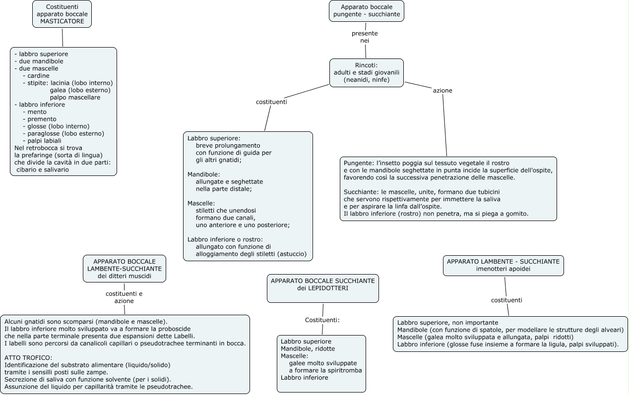 Questa Cmap, creata con IHMC CmapTools, contiene informazioni relative a: 02 Apparato boccale, Apparato boccale pungente - succhiante presente nei Rincoti: adulti e stadi giovanili (neanidi, ninfe), Rincoti: adulti e stadi giovanili (neanidi, ninfe) costituenti Labbro superiore: breve prolungamento con funzione di guida per gli altri gnatidi; Mandibole: allungate e seghettate nella parte distale; Mascelle: stiletti che unendosi formano due canali, uno anteriore e uno posteriore; Labbro inferiore o rostro: allungato con funzione di alloggiamento degli stiletti (astuccio), APPARATO LAMBENTE - SUCCHIANTE imenotteri apoidei costituenti Labbro superiore, non importante Mandibole (con funzione di spatole, per modellare le strutture degli alveari) Mascelle (galea molto sviluppata e allungata, palpi ridotti) Labbro inferiore (glosse fuse insieme a formare la ligula, palpi sviluppati)., Costituenti apparato boccale MASTICATORE - labbro superiore - due mandibole - due mascelle - cardine - stipite: lacinia (lobo interno) galea (lobo esterno) palpo mascellare - labbro inferiore - mento - premento - glosse (lobo interno) - paraglosse (lobo esterno) - palpi labiali Nel retrobocca si trova la prefaringe (sorta di lingua) che divide la cavità in due parti: cibario e salivario, Rincoti: adulti e stadi giovanili (neanidi, ninfe) azione Pungente: l’insetto poggia sul tessuto vegetale il rostro e con le mandibole seghettate in punta incide la superficie dell’ospite, favorendo così la successiva penetrazione delle mascelle. Succhiante: le mascelle, unite, formano due tubicini che servono rispettivamente per immettere la saliva e per aspirare la linfa dall’ospite. Il labbro inferiore (rostro) non penetra, ma si piega a gomito., APPARATO BOCCALE LAMBENTE-SUCCHIANTE dei ditteri muscidi costituenti e azione Alcuni gnatidi sono scomparsi (mandibole e mascelle). Il labbro inferiore molto sviluppato va a formare la proboscide che nella parte terminale presenta due espansioni dette Labelli. I labelli sono percorsi da canalicoli capillari o pseudotrachee terminanti in bocca. ATTO TROFICO: Identificazione del substrato alimentare (liquido/solido) tramite i sensilli posti sulle zampe. Secrezione di saliva con funzione solvente (per i solidi). Assunzione del liquido per capillarità tramite le pseudotrachee., APPARATO BOCCALE SUCCHIANTE dei LEPIDOTTERI Costituenti: Labbro superiore Mandibole, ridotte Mascelle: galee molto sviluppate a formare la spiritromba Labbro inferiore