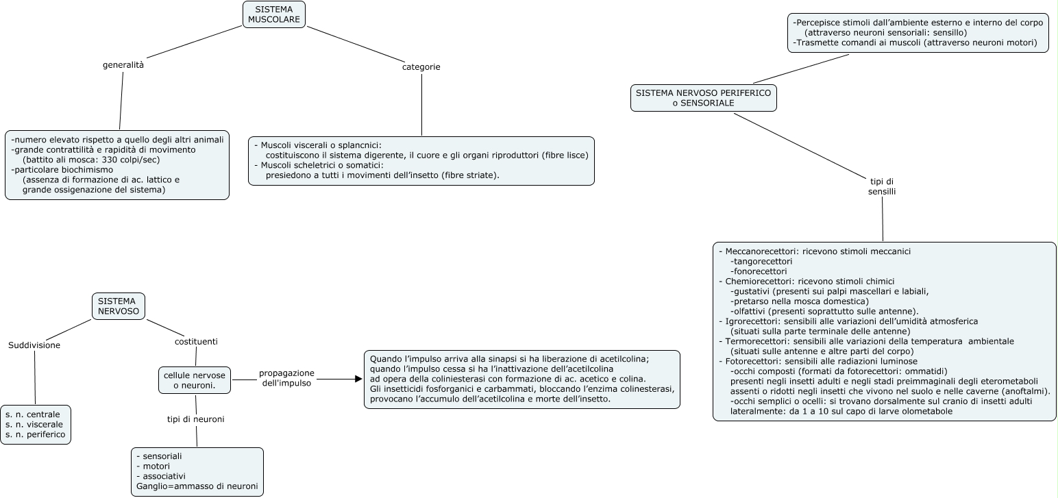 Questa Cmap, creata con IHMC CmapTools, contiene informazioni relative a: 04 Sistemi muscolare e nervoso, SISTEMA NERVOSO PERIFERICO o SENSORIALE tipi di sensilli - Meccanorecettori: ricevono stimoli meccanici -tangorecettori -fonorecettori - Chemiorecettori: ricevono stimoli chimici -gustativi (presenti sui palpi mascellari e labiali, -pretarso nella mosca domestica) -olfattivi (presenti soprattutto sulle antenne). - Igrorecettori: sensibili alle variazioni dell’umidità atmosferica (situati sulla parte terminale delle antenne) - Termorecettori: sensibili alle variazioni della temperatura ambientale (situati sulle antenne e altre parti del corpo) - Fotorecettori: sensibili alle radiazioni luminose -occhi composti (formati da fotorecettori: ommatidi) presenti negli insetti adulti e negli stadi preimmaginali degli eterometaboli assenti o ridotti negli insetti che vivono nel suolo e nelle caverne (anoftalmi). -occhi semplici o ocelli: si trovano dorsalmente sul cranio di insetti adulti lateralmente: da 1 a 10 sul capo di larve olometabole, SISTEMA NERVOSO Suddivisione s. n. centrale s. n. viscerale s. n. periferico, cellule nervose o neuroni. tipi di neuroni - sensoriali - motori - associativi Ganglio=ammasso di neuroni, cellule nervose o neuroni. propagazione dell'impulso Quando l’impulso arriva alla sinapsi si ha liberazione di acetilcolina; quando l’impulso cessa si ha l’inattivazione dell’acetilcolina ad opera della coliniesterasi con formazione di ac. acetico e colina. Gli insetticidi fosforganici e carbammati, bloccando l’enzima colinesterasi, provocano l’accumulo dell’acetilcolina e morte dell’insetto., SISTEMA NERVOSO PERIFERICO o SENSORIALE -Percepisce stimoli dall’ambiente esterno e interno del corpo (attraverso neuroni sensoriali: sensillo) -Trasmette comandi ai muscoli (attraverso neuroni motori), SISTEMA MUSCOLARE categorie - Muscoli viscerali o splancnici: costituiscono il sistema digerente, il cuore e gli organi riproduttori (fibre lisce) - Muscoli scheletrici o somatici: presiedono a tutti i movimenti dell’insetto (fibre striate)., SISTEMA NERVOSO costituenti cellule nervose o neuroni., SISTEMA MUSCOLARE generalità -numero elevato rispetto a quello degli altri animali -grande contrattilità e rapidità di movimento (battito ali mosca: 330 colpi/sec) -particolare biochimismo (assenza di formazione di ac. lattico e grande ossigenazione del sistema)