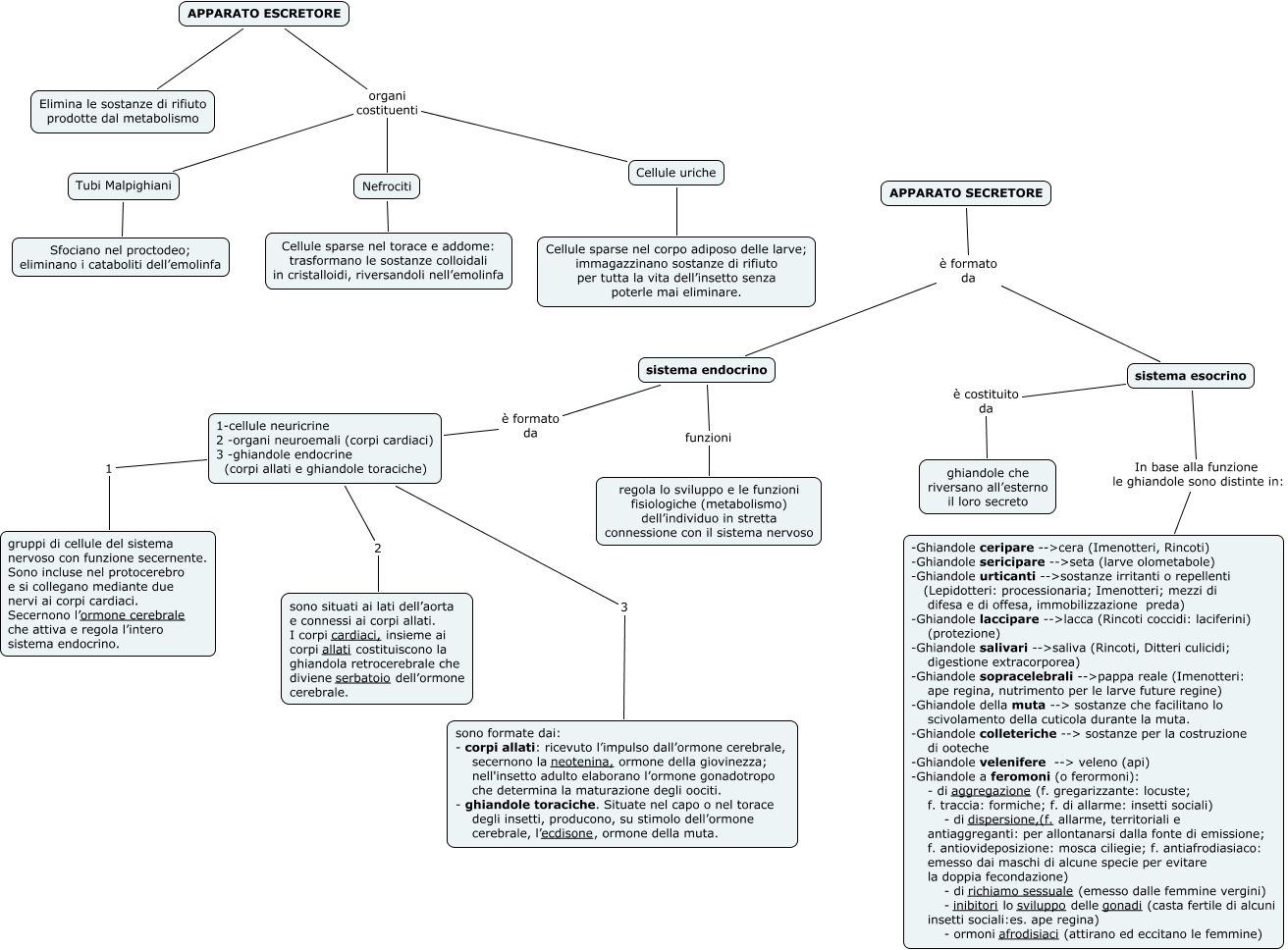 Questa Cmap, creata con IHMC CmapTools, contiene informazioni relative a: 07 Apparato escretore e secretore, APPARATO ESCRETORE Elimina le sostanze di rifiuto prodotte dal metabolismo, APPARATO ESCRETORE organi costituenti Tubi Malpighiani, sistema endocrino funzioni regola lo sviluppo e le funzioni fisiologiche (metabolismo) dell’individuo in stretta connessione con il sistema nervoso, 1-cellule neuricrine 2 -organi neuroemali (corpi cardiaci) 3 -ghiandole endocrine (corpi allati e ghiandole toraciche) 3 sono formate dai: - corpi allati: ricevuto l’impulso dall’ormone cerebrale, secernono la neotenina, ormone della giovinezza; nell'insetto adulto elaborano l’ormone gonadotropo che determina la maturazione degli oociti. - ghiandole toraciche. Situate nel capo o nel torace degli insetti, producono, su stimolo dell’ormone cerebrale, l’ecdisone, ormone della muta., APPARATO ESCRETORE organi costituenti Cellule uriche, APPARATO SECRETORE è formato da sistema endocrino, 1-cellule neuricrine 2 -organi neuroemali (corpi cardiaci) 3 -ghiandole endocrine (corpi allati e ghiandole toraciche) 1 gruppi di cellule del sistema nervoso con funzione secernente. Sono incluse nel protocerebro e si collegano mediante due nervi ai corpi cardiaci. Secernono l’ormone cerebrale che attiva e regola l’intero sistema endocrino., APPARATO ESCRETORE organi costituenti Nefrociti, Cellule uriche Cellule sparse nel corpo adiposo delle larve; immagazzinano sostanze di rifiuto per tutta la vita dell’insetto senza poterle mai eliminare., 1-cellule neuricrine 2 -organi neuroemali (corpi cardiaci) 3 -ghiandole endocrine (corpi allati e ghiandole toraciche) 2 sono situati ai lati dell’aorta e connessi ai corpi allati. I corpi cardiaci, insieme ai corpi allati costituiscono la ghiandola retrocerebrale che diviene serbatoio dell’ormone cerebrale., APPARATO SECRETORE è formato da sistema esocrino, sistema esocrino è costituito da ghiandole che riversano all’esterno il loro secreto, sistema esocrino In base alla funzione le ghiandole sono distinte in: -Ghiandole ceripare --> cera (Imenotteri, Rincoti) -Ghiandole sericipare --> seta (larve olometabole) -Ghiandole urticanti --> sostanze irritanti o repellenti (Lepidotteri: processionaria; Imenotteri; mezzi di difesa e di offesa, immobilizzazione preda) -Ghiandole laccipare --> lacca (Rincoti coccidi: laciferini) (protezione) -Ghiandole salivari --> saliva (Rincoti, Ditteri culicidi; digestione extracorporea) -Ghiandole sopracelebrali --> pappa reale (Imenotteri: ape regina, nutrimento per le larve future regine) -Ghiandole della muta --> sostanze che facilitano lo scivolamento della cuticola durante la muta. -Ghiandole colleteriche --> sostanze per la costruzione di ooteche -Ghiandole velenifere --> veleno (api) -Ghiandole a feromoni (o ferormoni): - di aggregazione (f. gregarizzante: locuste; f. traccia: formiche; f. di allarme: insetti sociali) - di dispersione,(f. allarme, territoriali e antiaggreganti: per allontanarsi dalla fonte di emissione; f. antiovideposizione: mosca ciliegie; f. antiafrodiasiaco: emesso dai maschi di alcune specie per evitare la doppia fecondazione) - di richiamo sessuale (emesso dalle femmine vergini) - inibitori lo sviluppo delle gonadi (casta fertile di alcuni insetti sociali:es. ape regina) - ormoni afrodisiaci (attirano ed eccitano le femmine), Tubi Malpighiani Sfociano nel proctodeo; eliminano i cataboliti dell’emolinfa, Nefrociti Cellule sparse nel torace e addome: trasformano le sostanze colloidali in cristalloidi, riversandoli nell’emolinfa