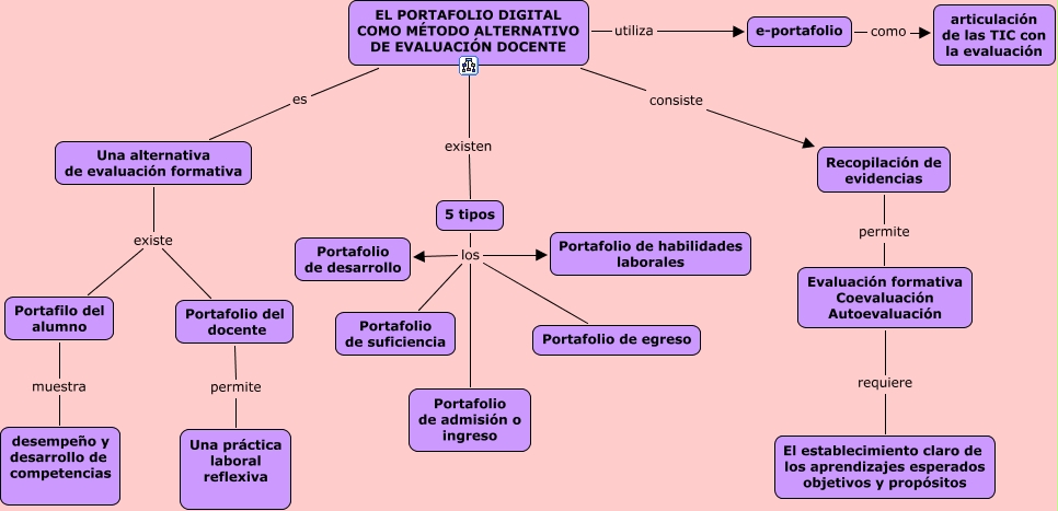 Este Cmap, tiene información relacionada con: El portafolio digital como método alternativo de evaluación docente, Una alternativa de evaluación formativa existe Portafolio del docente, 5 tipos los Portafolio de desarrollo, Recopilación de evidencias permite Evaluación formativa Coevaluación Autoevaluación, Portafilo del alumno muestra desempeño y desarrollo de competencias, 5 tipos los Portafolio de suficiencia, EL PORTAFOLIO DIGITAL COMO MÉTODO ALTERNATIVO DE EVALUACIÓN DOCENTE utiliza e-portafolio, 5 tipos los Portafolio de egreso, e-portafolio como articulación de las TIC con la evaluación, Una alternativa de evaluación formativa existe Portafilo del alumno, EL PORTAFOLIO DIGITAL COMO MÉTODO ALTERNATIVO DE EVALUACIÓN DOCENTE consiste Recopilación de evidencias, 5 tipos los Portafolio de habilidades laborales, Evaluación formativa Coevaluación Autoevaluación requiere El establecimiento claro de los aprendizajes esperados objetivos y propósitos, Portafolio del docente permite Una práctica laboral reflexiva, EL PORTAFOLIO DIGITAL COMO MÉTODO ALTERNATIVO DE EVALUACIÓN DOCENTE existen 5 tipos, EL PORTAFOLIO DIGITAL COMO MÉTODO ALTERNATIVO DE EVALUACIÓN DOCENTE es Una alternativa de evaluación formativa, 5 tipos los Portafolio de admisión o ingreso