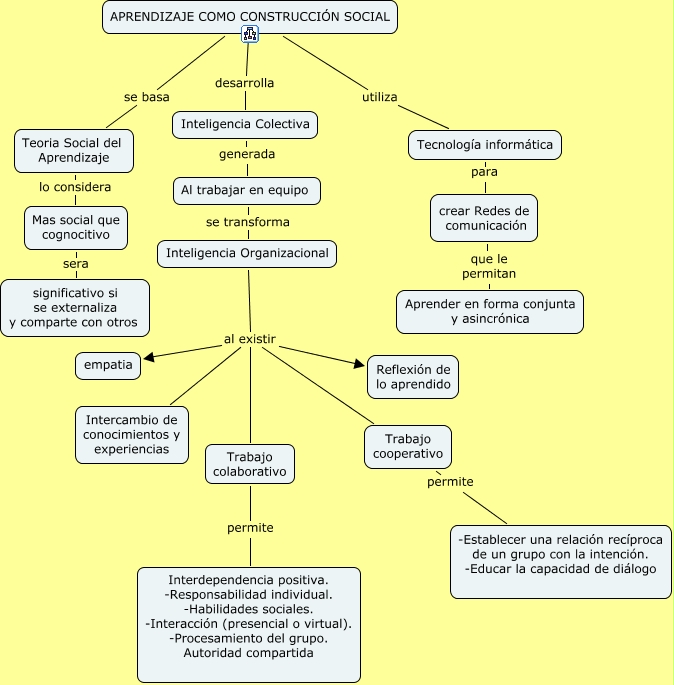Este Cmap, tiene información relacionada con: Aprendizaje cono construcción social, Inteligencia Organizacional al existir empatia, Inteligencia Organizacional al existir Trabajo colaborativo, crear Redes de comunicación que le permitan Aprender en forma conjunta y asincrónica, Inteligencia Organizacional al existir Reflexión de lo aprendido, Trabajo cooperativo permite -Establecer una relación recíproca de un grupo con la intención. -Educar la capacidad de diálogo, Trabajo colaborativo permite Interdependencia positiva. -Responsabilidad individual. -Habilidades sociales. -Interacción (presencial o virtual). -Procesamiento del grupo. Autoridad compartida, Inteligencia Organizacional al existir Trabajo cooperativo, Al trabajar en equipo se transforma Inteligencia Organizacional, Teoria Social del Aprendizaje lo considera Mas social que cognocitivo, APRENDIZAJE COMO CONSTRUCCIÓN SOCIAL desarrolla Inteligencia Colectiva, APRENDIZAJE COMO CONSTRUCCIÓN SOCIAL utiliza Tecnología informática, Mas social que cognocitivo sera significativo si se externaliza y comparte con otros, Inteligencia Colectiva generada Al trabajar en equipo, Tecnología informática para crear Redes de comunicación, APRENDIZAJE COMO CONSTRUCCIÓN SOCIAL se basa Teoria Social del Aprendizaje, Inteligencia Organizacional al existir Intercambio de conocimientos y experiencias