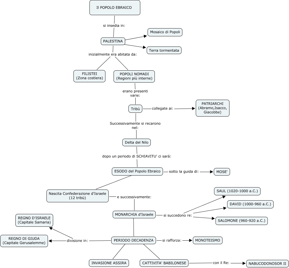 Questa Cmap, creata con IHMC CmapTools, contiene informazioni relative a: Popolo Ebraico, MONARCHIA d'Israele ???? PERIODO DECADENZA, Tribù Successivamente si recarono nel: Delta del Nilo, PERIODO DECADENZA divisione in: REGNO DI GIUDA (Capitale Gerusalemme), PALESTINA ???? Terra tormentata, PERIODO DECADENZA ???? INVASIONE ASSIRA, PALESTINA inizialmente era abitata da: FILISTEI (Zona costiera), Tribù collegate ai: PATRIARCHI (Abramo,Isacco, Giacobbe), Il POPOLO EBRAICO si insedia in: PALESTINA, Nascita Confederazione d'Israele (12 tribù) e successivamente: MONARCHIA d'Israele, POPOLI NOMADI (Regioni più interne) erano presenti varie: Tribù, PERIODO DECADENZA si rafforza: MONOTEISMO, ESODO del Popolo Ebraico sotto la guida di: MOSE', MONARCHIA d'Israele si succedono re: DAVID (1000-960 a.C.), PALESTINA inizialmente era abitata da: POPOLI NOMADI (Regioni più interne), ESODO del Popolo Ebraico ???? Nascita Confederazione d'Israele (12 tribù), PALESTINA ???? Mosaico di Popoli, PERIODO DECADENZA divisione in: REGNO D'ISRAELE (Capitale Samaria), MONARCHIA d'Israele si succedono re: SALOMONE (960-920 a.C.), MONARCHIA d'Israele si succedono re: SAUL (1020-1000 a.C.), PERIODO DECADENZA ???? CATTIVITA' BABILONESE