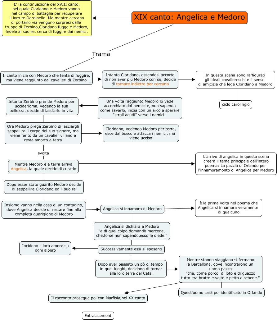 Questa Cmap, creata con IHMC CmapTools, contiene informazioni relative a: Angelica e Medoro - Mattia Guarneri, Ora Medoro prega Zerbino di lasciargli seppellire il corpo del suo signore, ma viene ferito da un cavalier villano e resta smorto a terra ???? Cloridano, vedendo Medoro per terra, esce dal bosco e attacca i nemici, ma viene ucciso, Mentre stanno viaggiano si fermano a Barcellona, dove incontrarono un uomo pazzo "che, come porco, di loto e di guazzo tutto era brutto e volto e petto e schene." ???? Quest'uomo sarà poi identificato in Orlando, Una volta raggiunto Medoro lo vede accerchiato dai nemici e, non sapendo come savarlo, inizia con un arco a sparare "strali acutii" verso i nemici. ???? Intanto Zerbino prende Medoro per ucciderloma, vedendo la sua bellezza, decide di lasciarlo in vita, Successivamente essi si sposano ???? Incidono il loro amore su ogni albero, In questa scena sono raffigurati gli ideali cavallereschi e il senso di amicizia che lega Cloridano a Medoro ???? ciclo carolingio, Il racconto prosegue poi con Marfisia,nel XX canto ???? Entralacement, Ora Medoro prega Zerbino di lasciargli seppellire il corpo del suo signore, ma viene ferito da un cavalier villano e resta smorto a terra svolta Mentre Medoro è a terra arriva Angelica, la quale decide di curarlo, XIX canto: Angelica e Medoro Trama Il canto inizia con Medoro che tenta di fuggire, ma viene raggiunto dai cavalieri di Zerbino, Mentre Medoro è a terra arriva Angelica, la quale decide di curarlo ???? L'arrivo di angelica in questa scena creerà il tema principale dell'intero poema: La pazzia di Orlando per l'innamoramonto di Angelica per Medoro, Successivamente essi si sposano ???? Dopo aver passato un pò di tempo in quei luoghi, decidono di tornar alla loro terra del Catai, Dopo esser stato guarito Medoro decide di seppellire Cloridano ed il suo re ???? Insieme vanno nella casa di un contadino, dove Angelica decide di restare fino alla completa guarigione di Medoro, Mentre stanno viaggiano si fermano a Barcellona, dove incontrarono un uomo pazzo "che, come porco, di loto e di guazzo tutto era brutto e volto e petto e schene." ???? Il racconto prosegue poi con Marfisia,nel XX canto, XIX canto: Angelica e Medoro E' la continuazione del XVIII canto, nel quale Cloridano e Medoro vanno nel campo di battaglia per recuperare il loro re Dardinello. Ma mentre cercano di portarlo via vengono sorpresi dalle truppe di Zerbino,Cloridano fugge e Medoro, fedele al suo re, cerca di fuggire dai nemici., Angelica si dichiara a Medoro "e di quel colpo domandò mercede, che,forse non sapendo,esso le diede." ???? Successivamente essi si sposano, Intanto Zerbino prende Medoro per ucciderloma, vedendo la sua bellezza, decide di lasciarlo in vita ???? Ora Medoro prega Zerbino di lasciargli seppellire il corpo del suo signore, ma viene ferito da un cavalier villano e resta smorto a terra, Insieme vanno nella casa di un contadino, dove Angelica decide di restare fino alla completa guarigione di Medoro ???? Angelica si innamora di Medoro, Intanto Cloridano, essendosi accorto di non aver più Medoro con sè, decide di tornare indietro per cercarlo ???? Una volta raggiunto Medoro lo vede accerchiato dai nemici e, non sapendo come savarlo, inizia con un arco a sparare "strali acutii" verso i nemici., Intanto Cloridano, essendosi accorto di non aver più Medoro con sè, decide di tornare indietro per cercarlo ???? In questa scena sono raffigurati gli ideali cavallereschi e il senso di amicizia che lega Cloridano a Medoro, Dopo aver passato un pò di tempo in quei luoghi, decidono di tornar alla loro terra del Catai ???? Mentre stanno viaggiano si fermano a Barcellona, dove incontrarono un uomo pazzo "che, come porco, di loto e di guazzo tutto era brutto e volto e petto e schene.", Angelica si innamora di Medoro ???? è la prima volta nel poema che Angelica si innamora veramente di qualcuno