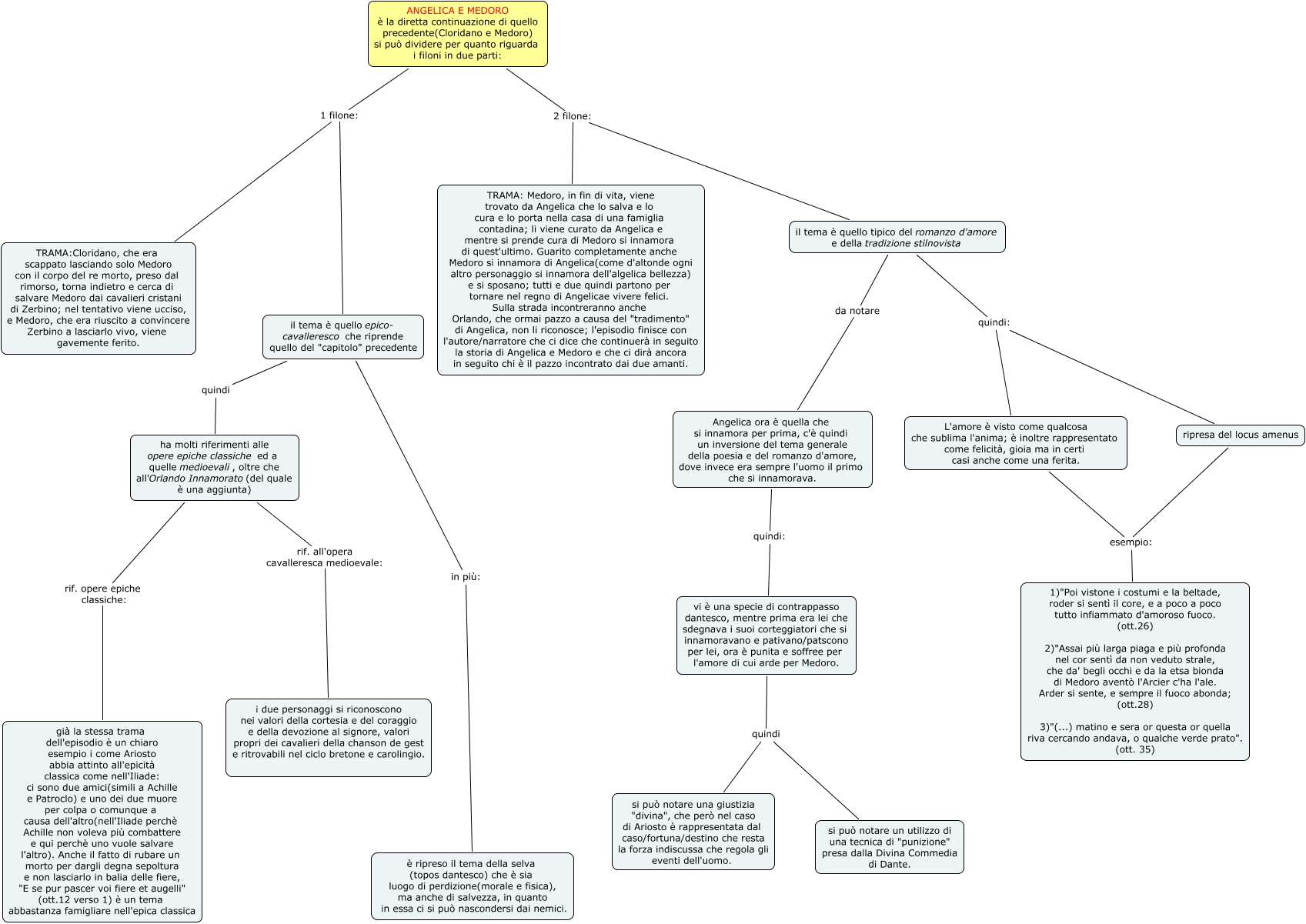 Questa Cmap, creata con IHMC CmapTools, contiene informazioni relative a: Angelica e Medoro-Francesco Ferrari, ha molti riferimenti alle opere epiche classiche ed a quelle medioevali, oltre che all'Orlando Innamorato(del quale è una aggiunta) rif. all'opera cavalleresca medioevale: i due personaggi si riconoscono nei valori della cortesia e del coraggio e della devozione al signore, valori propri dei cavalieri della chanson de gest e ritrovabili nel ciclo bretone e carolingio., ripresa del locus amenus esempio: 1)"Poi vistone i costumi e la beltade, roder si sentì il core, e a poco a poco tutto infiammato d'amoroso fuoco. (ott.26) 2)"Assai più larga piaga e più profonda nel cor sentì da non veduto strale, che da' begli occhi e da la etsa bionda di Medoro aventò l'Arcier c'ha l'ale. Arder si sente, e sempre il fuoco abonda; (ott.28) 3)"(...) matino e sera or questa or quella riva cercando andava, o qualche verde prato". (ott. 35), Angelica ora è quella che si innamora per prima, c'è quindi un inversione del tema generale della poesia e del romanzo d'amore, dove invece era sempre l'uomo il primo che si innamorava. quindi: vi è una specie di contrappasso dantesco, mentre prima era lei che sdegnava i suoi corteggiatori che si innamoravano e pativano/patscono per lei, ora è punita e soffree per l'amore di cui arde per Medoro., il tema è quello epico- cavalleresco che riprende quello del "capitolo" precedente in più: è ripreso il tema della selva (topos dantesco) che è sia luogo di perdizione(morale e fisica), ma anche di salvezza, in quanto in essa ci si può nascondersi dai nemici., ANGELICA E MEDORO è la diretta continuazione di quello precedente(Cloridano e Medoro) si può dividere per quanto riguarda i filoni in due parti: 2 filone: TRAMA: Medoro, in fin di vita, viene trovato da Angelica che lo salva e lo cura e lo porta nella casa di una famiglia contadina; li viene curato da Angelica e mentre si prende cura di Medoro si innamora di quest'ultimo. Guarito completamente anche Medoro si innamora di Angelica(come d'altonde ogni altro personaggio si innamora dell'algelica bellezza) e si sposano; tutti e due quindi partono per tornare nel regno di Angelicae vivere felici. Sulla strada incontreranno anche Orlando, che ormai pazzo a causa del "tradimento" di Angelica, non li riconosce; l'episodio finisce con l'autore/narratore che ci dice che continuerà in seguito la storia di Angelica e Medoro e che ci dirà ancora in seguito chi è il pazzo incontrato dai due amanti., ANGELICA E MEDORO è la diretta continuazione di quello precedente(Cloridano e Medoro) si può dividere per quanto riguarda i filoni in due parti: 1 filone: il tema è quello epico- cavalleresco che riprende quello del "capitolo" precedente, vi è una specie di contrappasso dantesco, mentre prima era lei che sdegnava i suoi corteggiatori che si innamoravano e pativano/patscono per lei, ora è punita e soffree per l'amore di cui arde per Medoro. quindi si può notare una giustizia "divina", che però nel caso di Ariosto è rappresentata dal caso/fortuna/destino che resta la forza indiscussa che regola gli eventi dell'uomo., il tema è quello epico- cavalleresco che riprende quello del "capitolo" precedente quindi ha molti riferimenti alle opere epiche classiche ed a quelle medioevali, oltre che all'Orlando Innamorato(del quale è una aggiunta), vi è una specie di contrappasso dantesco, mentre prima era lei che sdegnava i suoi corteggiatori che si innamoravano e pativano/patscono per lei, ora è punita e soffree per l'amore di cui arde per Medoro. quindi si può notare un utilizzo di una tecnica di "punizione" presa dalla Divina Commedia di Dante., ANGELICA E MEDORO è la diretta continuazione di quello precedente(Cloridano e Medoro) si può dividere per quanto riguarda i filoni in due parti: 2 filone: il tema è quello tipico del romanzo d'amore e della tradizione stilnovista, il tema è quello tipico del romanzo d'amore e della tradizione stilnovista da notare Angelica ora è quella che si innamora per prima, c'è quindi un inversione del tema generale della poesia e del romanzo d'amore, dove invece era sempre l'uomo il primo che si innamorava., il tema è quello tipico del romanzo d'amore e della tradizione stilnovista quindi: L'amore è visto come qualcosa che sublima l'anima; è inoltre rappresentato come felicità, gioia ma in certi casi anche come una ferita., ANGELICA E MEDORO è la diretta continuazione di quello precedente(Cloridano e Medoro) si può dividere per quanto riguarda i filoni in due parti: 1 filone: TRAMA:Cloridano, che era scappato lasciando solo Medoro con il corpo del re morto, preso dal rimorso, torna indietro e cerca di salvare Medoro dai cavalieri cristani di Zerbino; nel tentativo viene ucciso, e Medoro, che era riuscito a convincere Zerbino a lasciarlo vivo, viene gavemente ferito., L'amore è visto come qualcosa che sublima l'anima; è inoltre rappresentato come felicità, gioia ma in certi casi anche come una ferita. esempio: 1)"Poi vistone i costumi e la beltade, roder si sentì il core, e a poco a poco tutto infiammato d'amoroso fuoco. (ott.26) 2)"Assai più larga piaga e più profonda nel cor sentì da non veduto strale, che da' begli occhi e da la etsa bionda di Medoro aventò l'Arcier c'ha l'ale. Arder si sente, e sempre il fuoco abonda; (ott.28) 3)"(...) matino e sera or questa or quella riva cercando andava, o qualche verde prato". (ott. 35), ha molti riferimenti alle opere epiche classiche ed a quelle medioevali, oltre che all'Orlando Innamorato(del quale è una aggiunta) rif. opere epiche classiche: già la stessa trama dell'episodio è un chiaro esempio i come Ariosto abbia attinto all'epicità classica come nell'Iliade: ci sono due amici(simili a Achille e Patroclo) e uno dei due muore per colpa o comunque a causa dell'altro(nell'Iliade perchè Achille non voleva più combattere e qui perchè uno vuole salvare l'altro). Anche il fatto di rubare un morto per dargli degna s