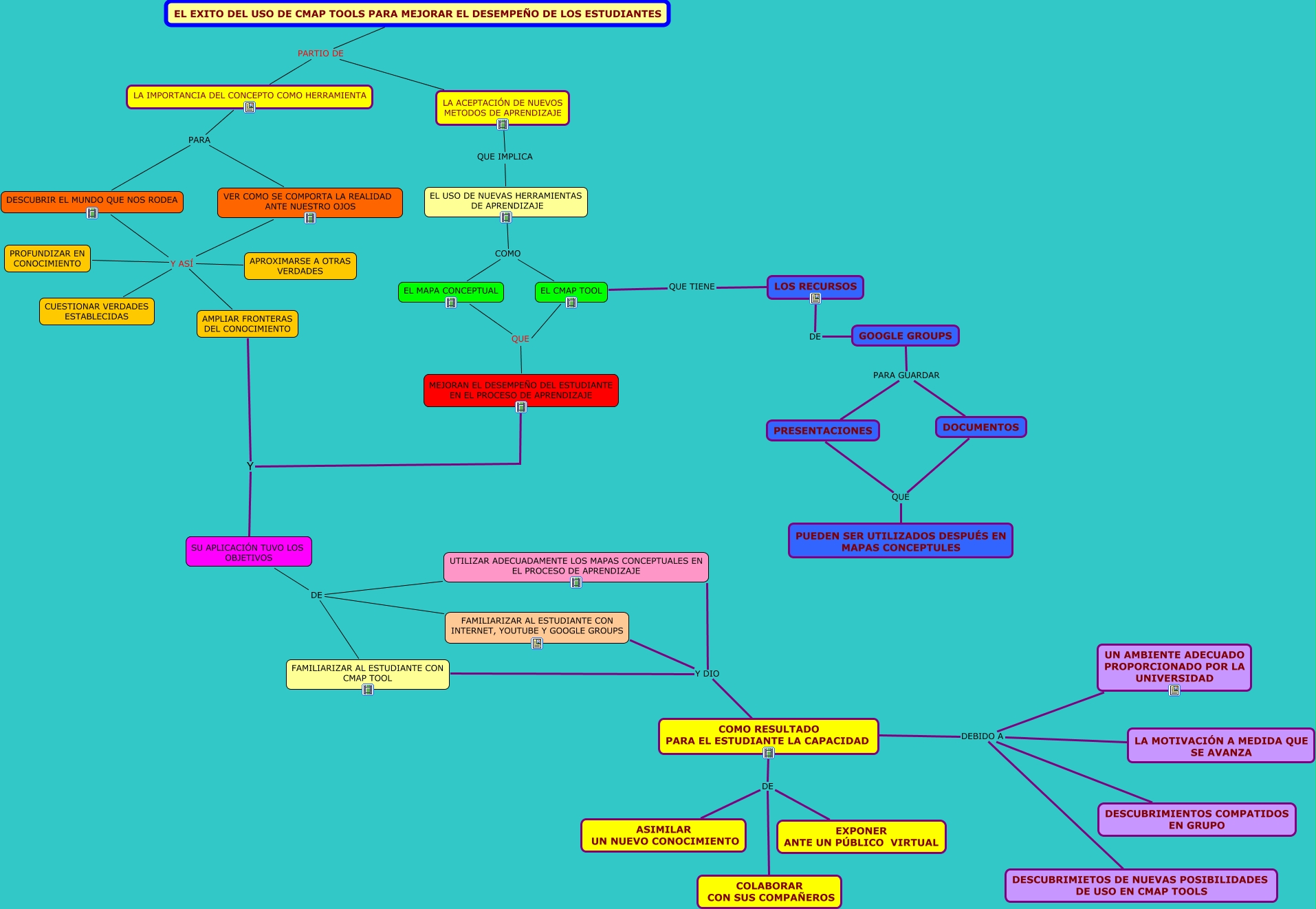 Este Cmap, tiene información relacionada con: EXPERIENCIA EXITOSA EN EL USO DE CMAP TOOLS, GOOGLE GROUPS PARA GUARDAR PRESENTACIONES, LA IMPORTANCIA DEL CONCEPTO COMO HERRAMIENTA PARA DESCUBRIR EL MUNDO QUE NOS RODEA, COMO RESULTADO PARA EL ESTUDIANTE LA CAPACIDAD DE EXPONER ANTE UN PÚBLICO VIRTUAL, DESCUBRIR EL MUNDO QUE NOS RODEA Y ASÍ PROFUNDIZAR EN CONOCIMIENTO, EL MAPA CONCEPTUAL QUE MEJORAN EL DESEMPEÑO DEL ESTUDIANTE EN EL PROCESO DE APRENDIZAJE, VER COMO SE COMPORTA LA REALIDAD ANTE NUESTRO OJOS Y ASÍ APROXIMARSE A OTRAS VERDADES, DESCUBRIMIETOS DE NUEVAS POSIBILIDADES DE USO EN CMAP TOOLS DEBIDO A UN AMBIENTE ADECUADO PROPORCIONADO POR LA UNIVERSIDAD, LA ACEPTACIÓN DE NUEVOS METODOS DE APRENDIZAJE QUE IMPLICA EL USO DE NUEVAS HERRAMIENTAS DE APRENDIZAJE, COMO RESULTADO PARA EL ESTUDIANTE LA CAPACIDAD Y DIO FAMILIARIZAR AL ESTUDIANTE CON INTERNET, YOUTUBE Y GOOGLE GROUPS, DESCUBRIR EL MUNDO QUE NOS RODEA Y ASÍ APROXIMARSE A OTRAS VERDADES, DESCUBRIMIETOS DE NUEVAS POSIBILIDADES DE USO EN CMAP TOOLS DEBIDO A DESCUBRIMIENTOS COMPATIDOS EN GRUPO, VER COMO SE COMPORTA LA REALIDAD ANTE NUESTRO OJOS Y ASÍ AMPLIAR FRONTERAS DEL CONOCIMIENTO, SU APLICACIÓN TUVO LOS OBJETIVOS DE FAMILIARIZAR AL ESTUDIANTE CON CMAP TOOL, PUEDEN SER UTILIZADOS DESPUÉS EN MAPAS CONCEPTULES QUE DOCUMENTOS, COMO RESULTADO PARA EL ESTUDIANTE LA CAPACIDAD Y DIO FAMILIARIZAR AL ESTUDIANTE CON CMAP TOOL, COMO RESULTADO PARA EL ESTUDIANTE LA CAPACIDAD Y DIO UTILIZAR ADECUADAMENTE LOS MAPAS CONCEPTUALES EN EL PROCESO DE APRENDIZAJE, EL EXITO DEL USO DE CMAP TOOLS PARA MEJORAR EL DESEMPEÑO DE LOS ESTUDIANTES PARTIO DE LA ACEPTACIÓN DE NUEVOS METODOS DE APRENDIZAJE, LA IMPORTANCIA DEL CONCEPTO COMO HERRAMIENTA PARA VER COMO SE COMPORTA LA REALIDAD ANTE NUESTRO OJOS, EL USO DE NUEVAS HERRAMIENTAS DE APRENDIZAJE COMO EL MAPA CONCEPTUAL, EL CMAP TOOL QUE TIENE LOS RECURSOS