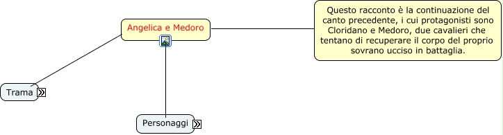 Questa Cmap, creata con IHMC CmapTools, contiene informazioni relative a: Angelica e Medoro - Ghilardi.cmap, Cavaliere villano Colui che pugnala Medoro., Personaggi Angelica, Cloridano tenta di salvarlo uccidendo due dei soldati di Zerbino. Zerbino minaccia Medoro a causa di ciò, "ma come gli occhi a quel bel volto mise, gli ne venne pietade, e non l'uccise"., Medoro viene descritto con le caratteristiche fisiche (di bell'aspetto, biondo, con dei begl'occhi) proprie della "donna angelicata". Stil Novo., Nel frattempo, il suo compagno Cloridano si era messo al sicuro, ma essendosi accorto di aver perso di vista il suo amico decide di andare alla sua ricerca. Lo trova accerchiato dai nemici ed in pericolo di vita., La ragazza si dichiara. "Dunque, rotto ogni freno di vergogna, la lingua ebbe non men che gli occhi arditi: e di quel colpo domandò mercede, che, forse non sapendo, esso le diede"., Angelica non ha occhi che per lui. scrivono i loro nomi sugli alberi, sui sassi, in mille luoghi., I due si sposano. Angelica non ha occhi che per lui., "Dunque, rotto ogni freno di vergogna, la lingua ebbe non men che gli occhi arditi: e di quel colpo domandò mercede, che, forse non sapendo, esso le diede". Riferimento allo Stil Novo: l'amore passa attraverso gli occhi., Col passare del tempo l'amore di Angelica verso Medoro aumenta. Medoro viene descritto con le caratteristiche fisiche (di bell'aspetto, biondo, con dei begl'occhi) proprie della "donna angelicata"., Personaggi Zerbino, Comparsa di Angelica. "Gli sopravenne a caso una donzella, avolta in pastorale et umil veste, ma di real presenza e in viso bella, d'alte maniere e accortamente oneste.", Angelica non ha occhi che per lui. Entrelacement Ariosto conclude il canto dicendo di riprender a parlare di Marfisa., Un cavaliere villano colpisce al petto Medoro. Cloridano, pensando che l'amico fosse morto, esce allo scoperto e attacca i nemici, ma viene ucciso. "Si lascia a canto al suo Medor cadere"., "Gli sopravenne a caso una donzella, avolta in pastorale et umil veste, ma di real presenza e in viso bella, d'alte maniere e accortamente oneste." Riferimento alla donna dello Stil Novo., Angelica e Medoro Questo racconto è la continuazione del canto precedente, i cui protagonisti sono Cloridano e Medoro, due cavalieri che tentano di recuperare il corpo del proprio sovrano ucciso in battaglia., Angelica non ha occhi che per lui. Decidono di lasciar la casa del pastore e vanno in Spagna dove incontrano un uomo pazzo che in seguito si scoprirà essere Orlando., Lo trova accerchiato dai nemici ed in pericolo di vita. Cloridano tenta di salvarlo uccidendo due dei soldati di Zerbino., "Angelica a Medor la prima rosa coglier lasciò, non ancor tocca inante". Topos della rosa: analogia simbolica tra la rosa e la donna e fra la rosa e l'amore., Nel frattempo, il suo compagno Cloridano si era messo al sicuro, ma essendosi accorto di aver perso di vista il suo amico decide di andare alla sua ricerca. Emergono: la nobiltà d'animo del cavaliere e il forte legame d'amicizia.