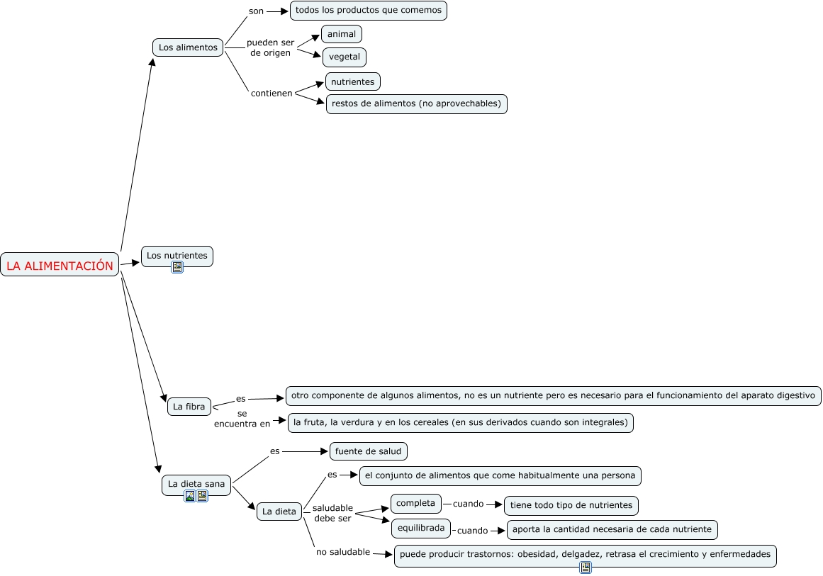 Este Cmap, tiene información relacionada con: La alimentación B, La dieta saludable debe ser completa, Los alimentos son todos los productos que comemos, La dieta sana La dieta, completa cuando tiene todo tipo de nutrientes, La dieta no saludable puede producir trastornos: obesidad, delgadez, retrasa el crecimiento y enfermedades, Los alimentos contienen restos de alimentos (no aprovechables), La dieta es el conjunto de alimentos que come habitualmente una persona, Los alimentos pueden ser de origen vegetal, La dieta sana es fuente de salud, LA ALIMENTACIÓN Los alimentos, equilibrada cuando aporta la cantidad necesaria de cada nutriente, LA ALIMENTACIÓN La dieta sana, LA ALIMENTACIÓN La fibra, La fibra es otro componente de algunos alimentos, no es un nutriente pero es necesario para el funcionamiento del aparato digestivo, La dieta saludable debe ser equilibrada, Los alimentos contienen nutrientes, La fibra se encuentra en la fruta, la verdura y en los cereales (en sus derivados cuando son integrales), LA ALIMENTACIÓN Los nutrientes, Los alimentos pueden ser de origen animal