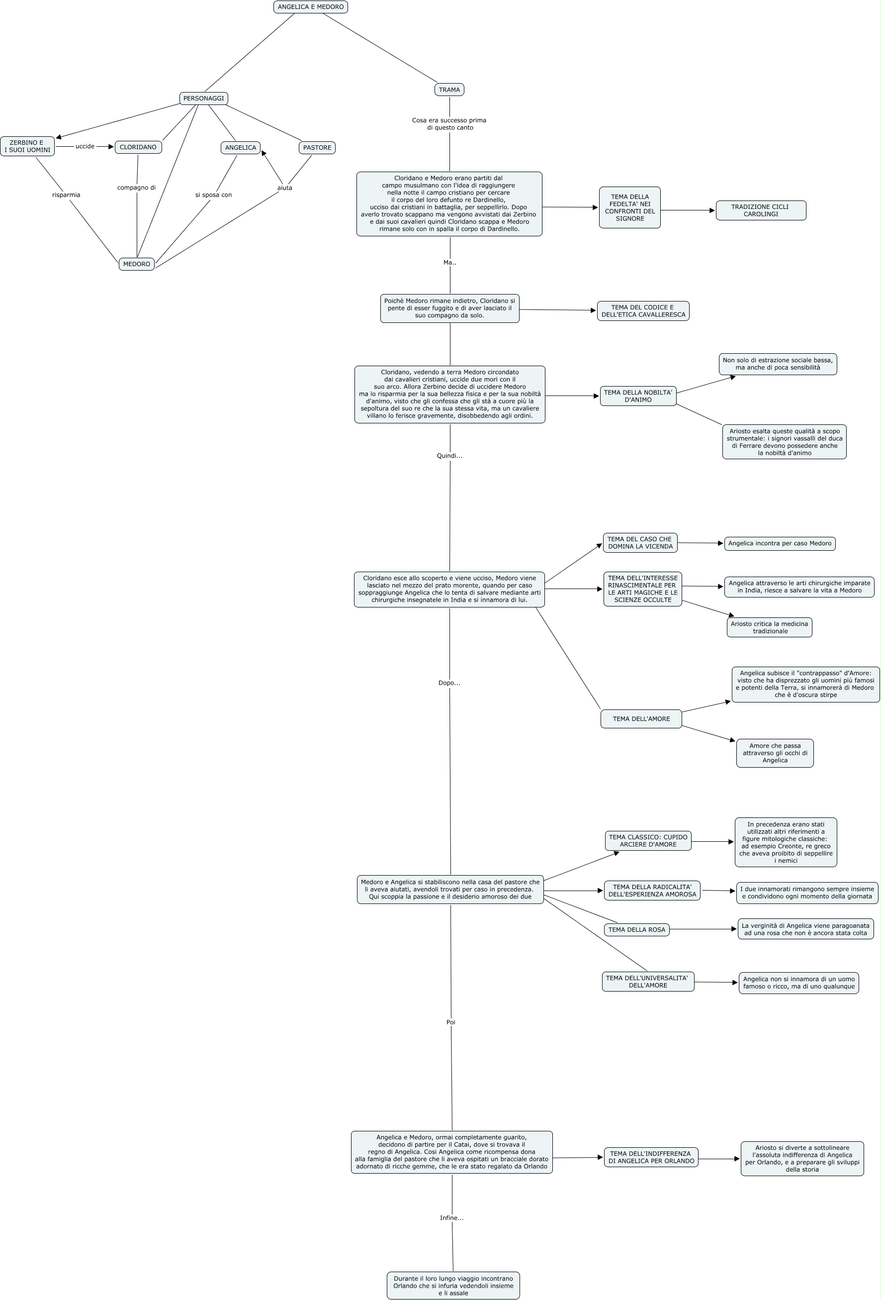 Questa Cmap, creata con IHMC CmapTools, contiene informazioni relative a: ANGELICA E MEDORO - ORLANDO FURIOSO - ARIOSTO, TEMA DELL'UNIVERSALITA' DELL'AMORE ???? Angelica non si innamora di un uomo famoso o ricco, ma di uno qualunque, Poichè Medoro rimane indietro, Cloridano si pente di esser fuggito e di aver lasciato il suo compagno da solo. ???? Cloridano, vedendo a terra Medoro circondato dai cavalieri cristiani, uccide due mori con il suo arco. Allora Zerbino decide di uccidere Medoro ma lo risparmia per la sua bellezza fisica e per la sua nobiltà d'animo, visto che gli confessa che gli stà a cuore più la sepoltura del suo re che la sua stessa vita, ma un cavaliere villano lo ferisce gravemente, disobbedendo agli ordini., TRAMA Cosa era successo prima di questo canto Cloridano e Medoro erano partiti dal campo musulmano con l'idea di raggiungere nella notte il campo cristiano per cercare il corpo del loro defunto re Dardinello, ucciso dai cristiani in battaglia, per seppellirlo. Dopo averlo trovato scappano ma vengono avvistati dai Zerbino e dai suoi cavalieri quindi Cloridano scappa e Medoro rimane solo con in spalla il corpo di Dardinello., PERSONAGGI ???? ZERBINO E I SUOI UOMINI, TEMA DELL'INTERESSE RINASCIMENTALE PER LE ARTI MAGICHE E LE SCIENZE OCCULTE ???? Angelica attraverso le arti chirurgiche imparate in India, riesce a salvare la vita a Medoro, TEMA CLASSICO: CUPIDO ARCIERE D'AMORE ???? In precedenza erano stati utilizzati altri riferimenti a figure mitologiche classiche: ad esempio Creonte, re greco che aveva proibito di seppellire i nemici, PASTORE aiuta ANGELICA, TEMA DELLA ROSA ???? La verginità di Angelica viene paragoanata ad una rosa che non è ancora stata colta, PASTORE aiuta MEDORO, Cloridano esce allo scoperto e viene ucciso, Medoro viene lasciato nel mezzo del prato morente, quando per caso soppraggiunge Angelica che lo tenta di salvare mediante arti chirurgiche insegnatele in India e si innamora di lui. ???? TEMA DELL'INTERESSE RINASCIMENTALE PER LE ARTI MAGICHE E LE SCIENZE OCCULTE, Cloridano, vedendo a terra Medoro circondato dai cavalieri cristiani, uccide due mori con il suo arco. Allora Zerbino decide di uccidere Medoro ma lo risparmia per la sua bellezza fisica e per la sua nobiltà d'animo, visto che gli confessa che gli stà a cuore più la sepoltura del suo re che la sua stessa vita, ma un cavaliere villano lo ferisce gravemente, disobbedendo agli ordini. ???? TEMA DELLA NOBILTA' D'ANIMO, Cloridano e Medoro erano partiti dal campo musulmano con l'idea di raggiungere nella notte il campo cristiano per cercare il corpo del loro defunto re Dardinello, ucciso dai cristiani in battaglia, per seppellirlo. Dopo averlo trovato scappano ma vengono avvistati dai Zerbino e dai suoi cavalieri quindi Cloridano scappa e Medoro rimane solo con in spalla il corpo di Dardinello. Ma.. Poichè Medoro rimane indietro, Cloridano si pente di esser fuggito e di aver lasciato il suo compagno da solo., ANGELICA E MEDORO ???? PERSONAGGI, TEMA DELL'INTERESSE RINASCIMENTALE PER LE ARTI MAGICHE E LE SCIENZE OCCULTE ???? Ariosto critica la medicina tradizionale, Medoro e Angelica si stabiliscono nella casa del pastore che li aveva aiutati, avendoli trovati per caso in precedenza. Qui scoppia la passione e il desiderio amoroso dei due ???? TEMA DELLA ROSA, Cloridano e Medoro erano partiti dal campo musulmano con l'idea di raggiungere nella notte il campo cristiano per cercare il corpo del loro defunto re Dardinello, ucciso dai cristiani in battaglia, per seppellirlo. Dopo averlo trovato scappano ma vengono avvistati dai Zerbino e dai suoi cavalieri quindi Cloridano scappa e Medoro rimane solo con in spalla il corpo di Dardinello. ???? TEMA DELLA FEDELTA' NEI CONFRONTI DEL SIGNORE, Cloridano esce allo scoperto e viene ucciso, Medoro viene lasciato nel mezzo del prato morente, quando per caso soppraggiunge Angelica che lo tenta di salvare mediante arti chirurgiche insegnatele in India e si innamora di lui. ???? TEMA DELL'AMORE, PERSONAGGI ???? ANGELICA, Cloridano esce allo scoperto e viene ucciso, Medoro viene lasciato nel mezzo del prato morente, quando per caso soppraggiunge Angelica che lo tenta di salvare mediante arti chirurgiche insegnatele in India e si innamora di lui. ???? TEMA DEL CASO CHE DOMINA LA VICENDA, Cloridano esce allo scoperto e viene ucciso, Medoro viene lasciato nel mezzo del prato morente, quando per caso soppraggiunge Angelica che lo tenta di salvare mediante arti chirurgiche insegnatele in India e si innamora di lui. Dopo... Medoro e Angelica si stabiliscono nella casa del pastore che li aveva aiutati, avendoli trovati per caso in precedenza. Qui scoppia la passione e il desiderio amoroso dei due